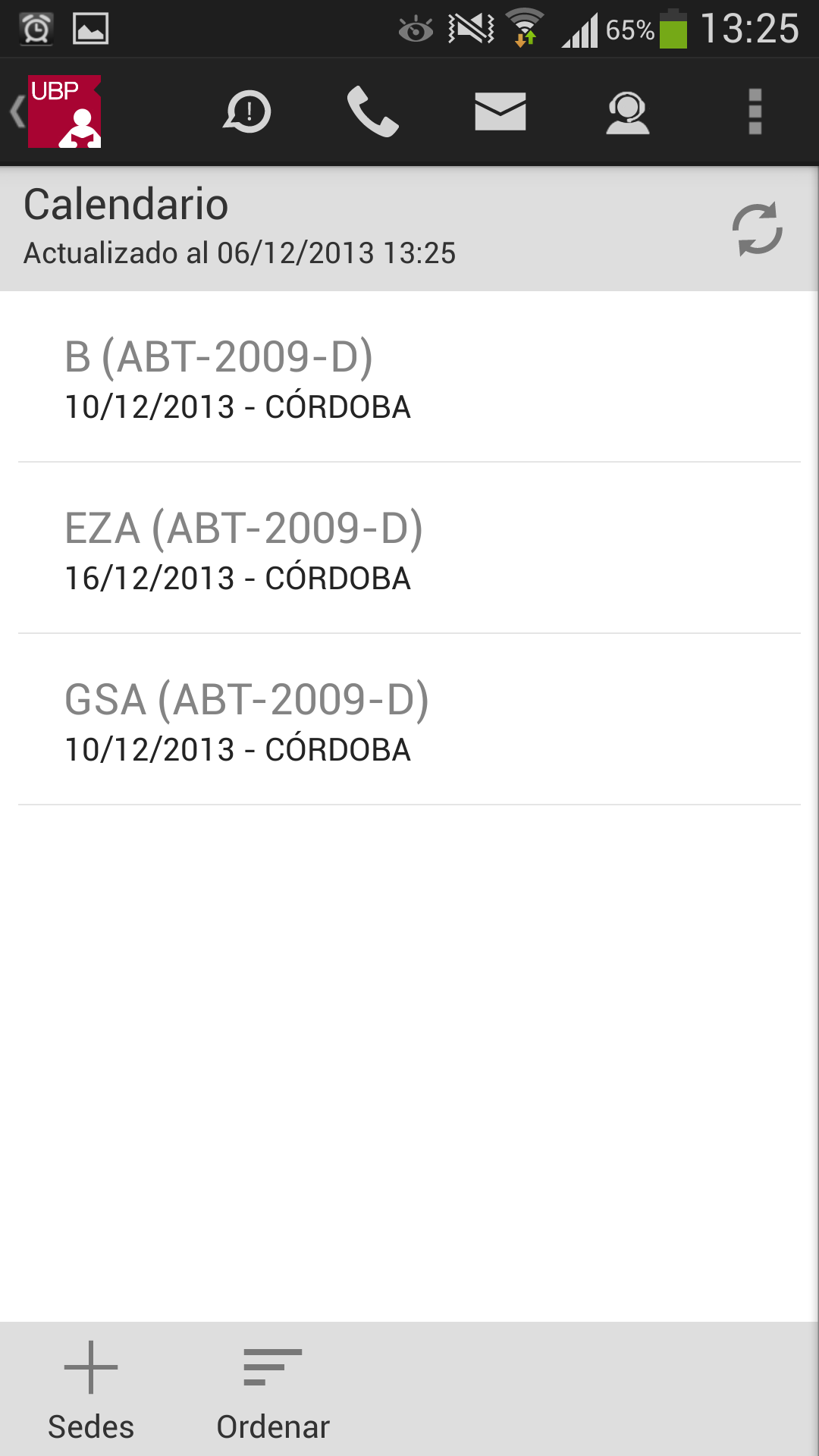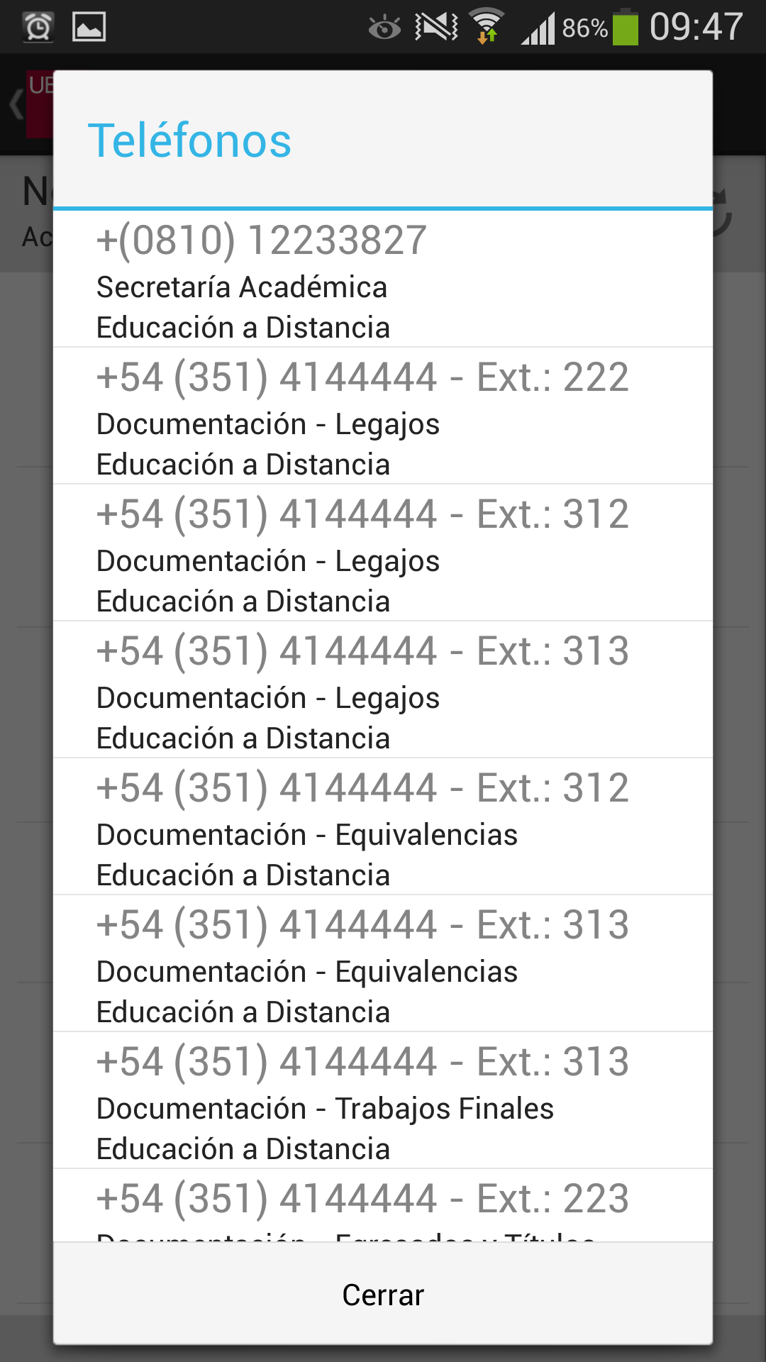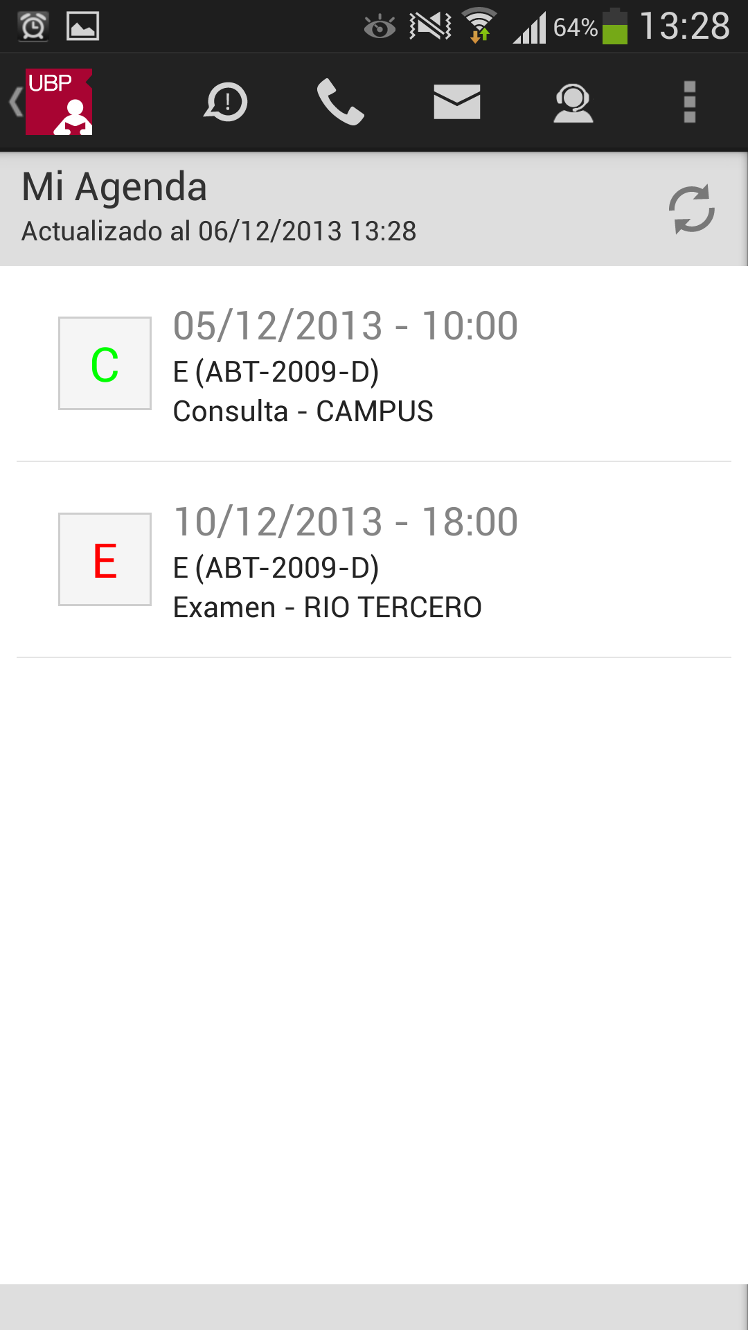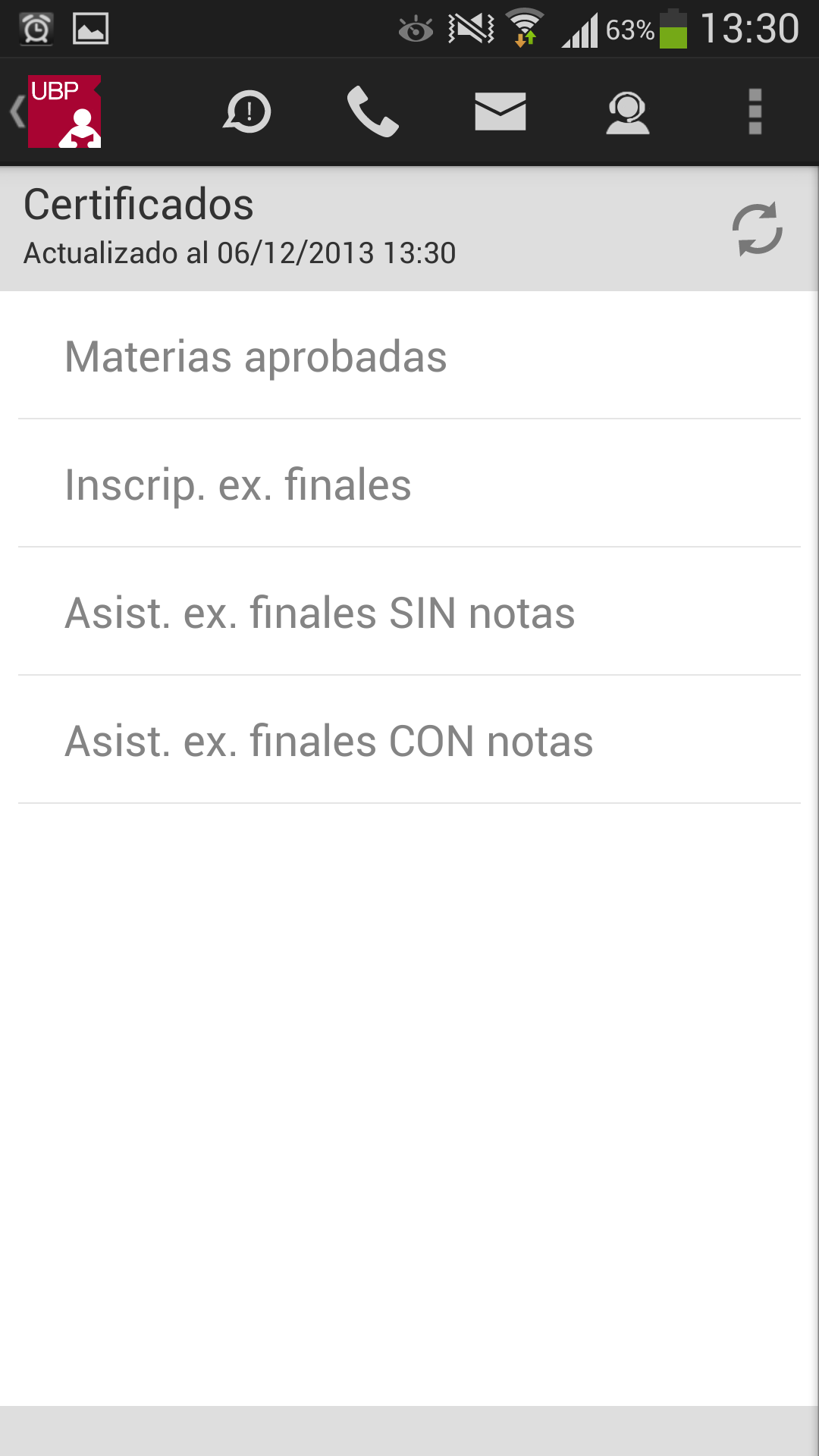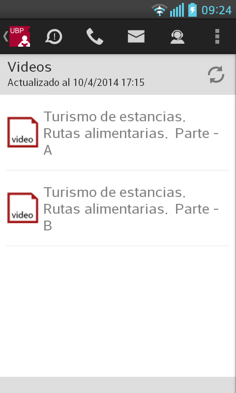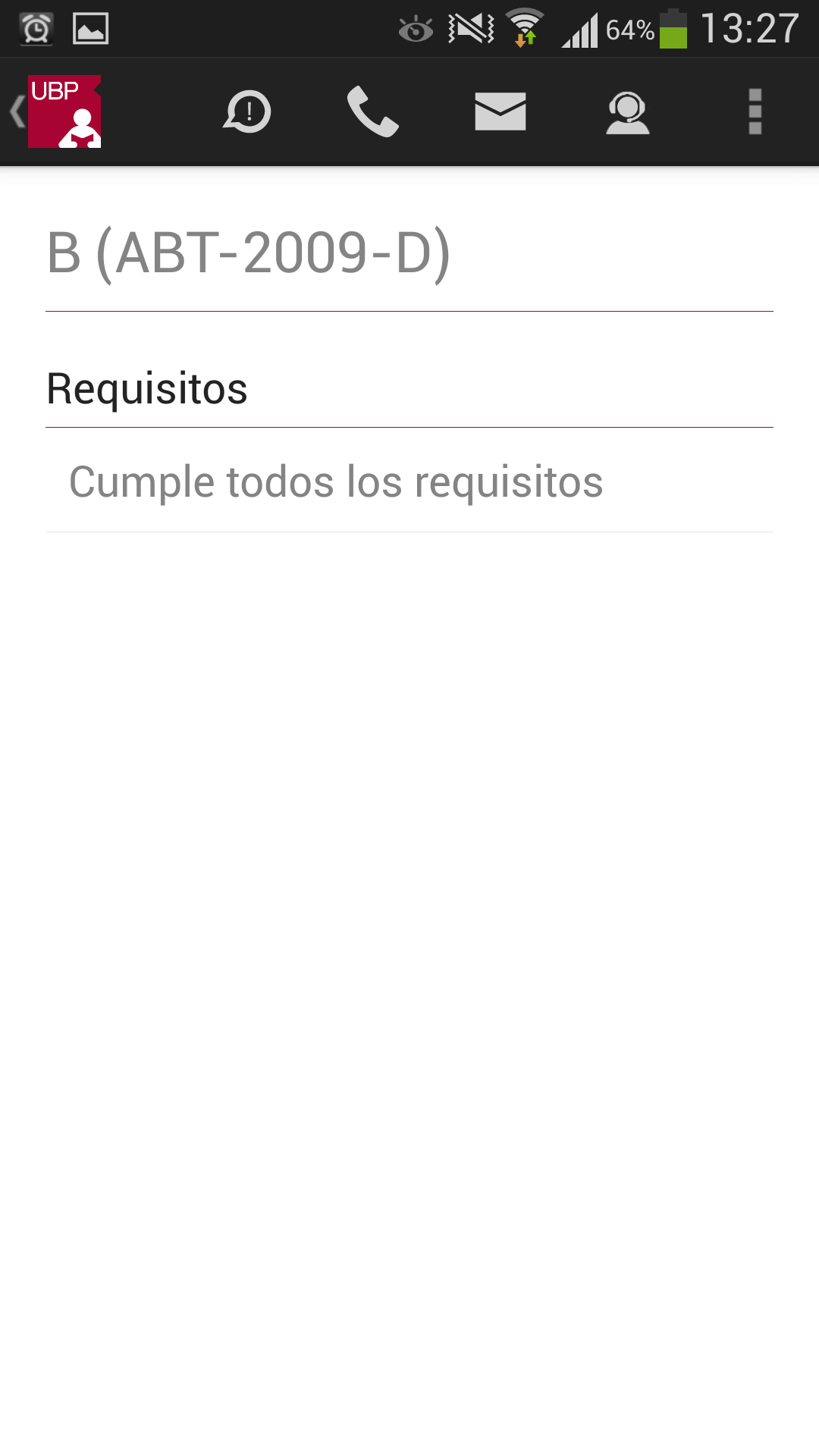 Llamar a la UBP: En el caso de que desee comunicarse con la UBP, esta opción provee un listado de teléfonos de las distintas áreas. Solo se debe tocar el teléfono al que se quiere llamar y se realizará la llamada automáticamente incluyendo la derivación a un interno o a una opción indicada por la central telefónica.