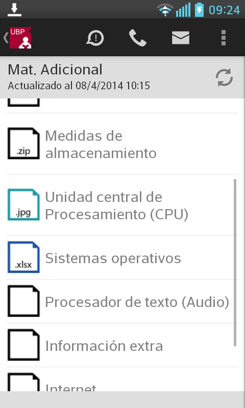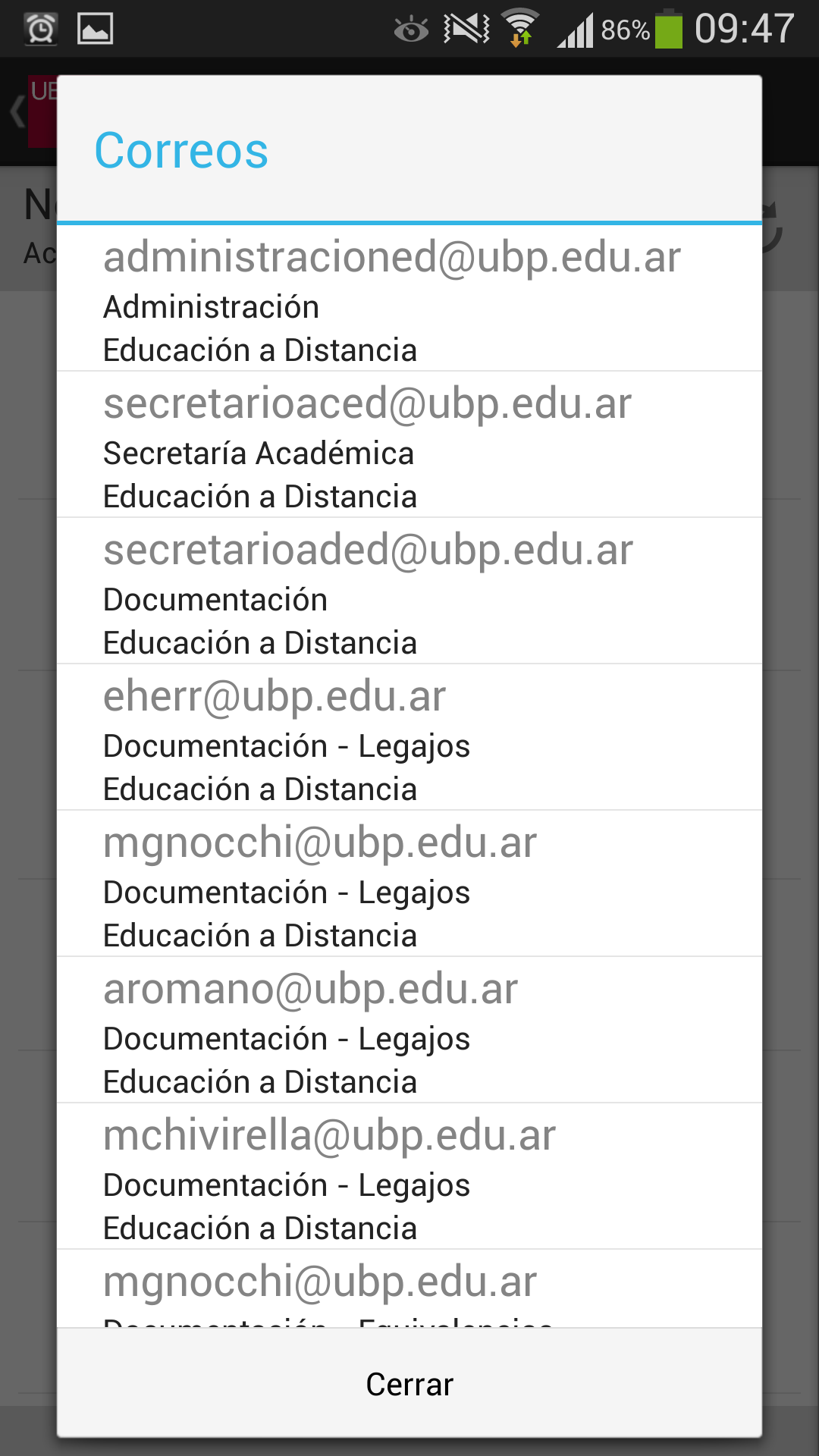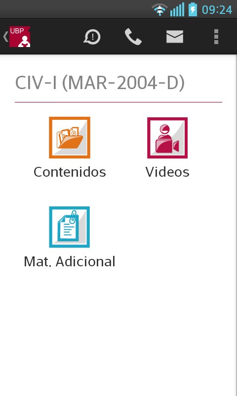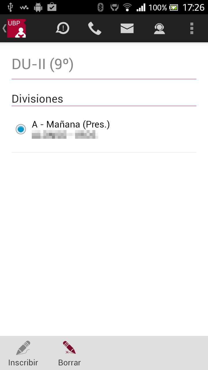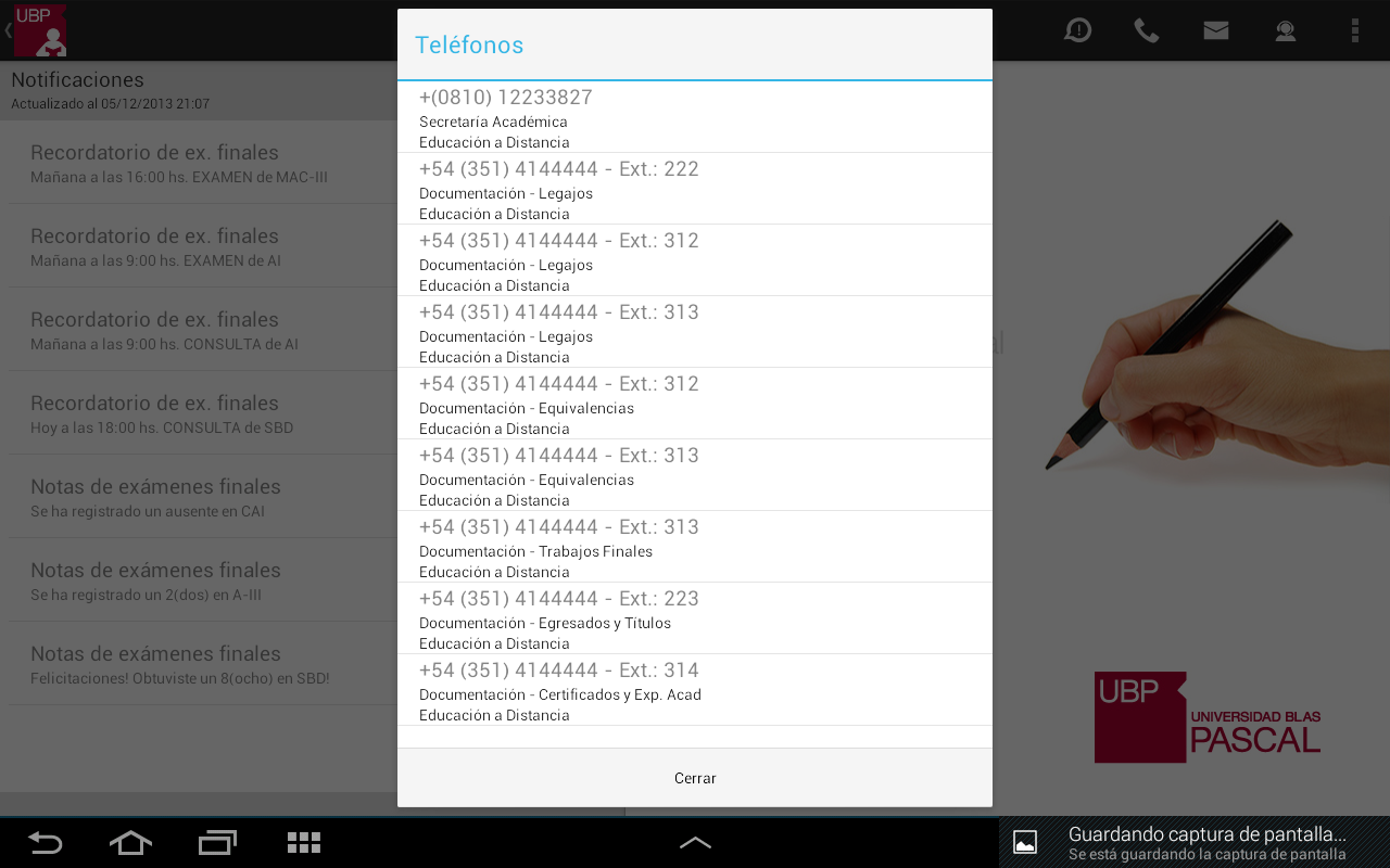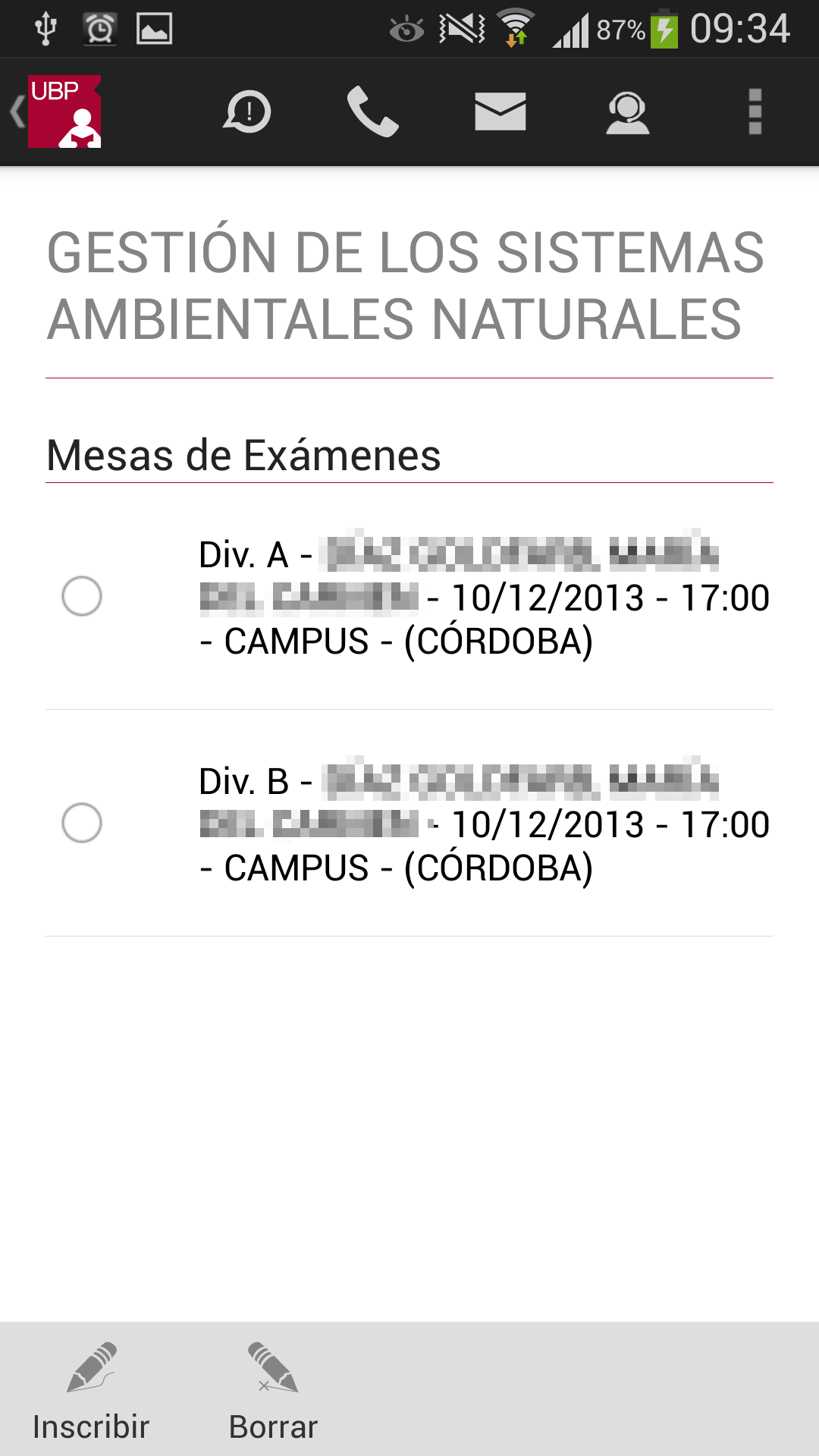 Llamar a la UBP: En el caso de que desee comunicarse con la UBP, esta opción provee un listado de teléfonos de las distintas áreas. Solo se debe tocar el teléfono al que se quiere llamar y se realizará la llamada automáticamente incluyendo la derivación a un interno o a una opción indicada por la central telefónica.