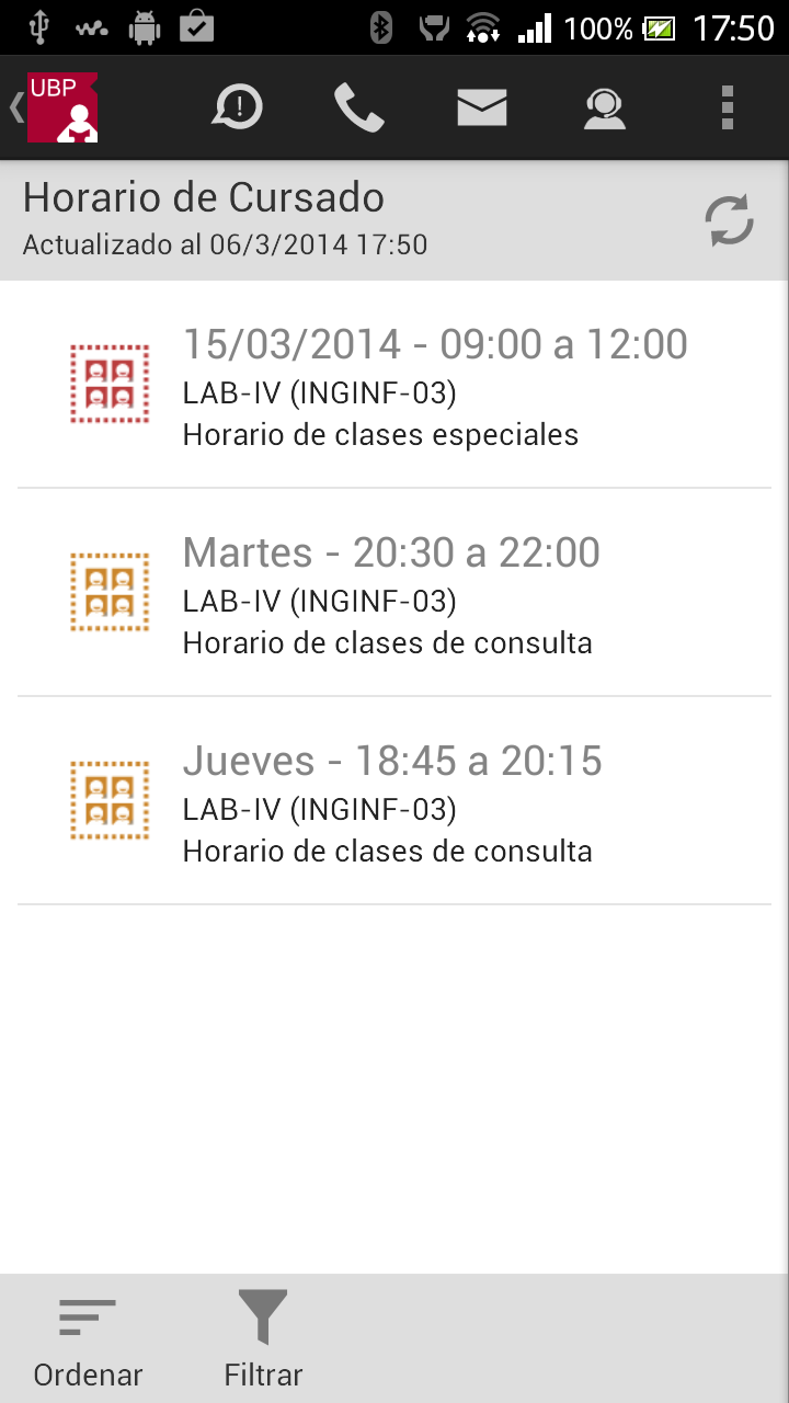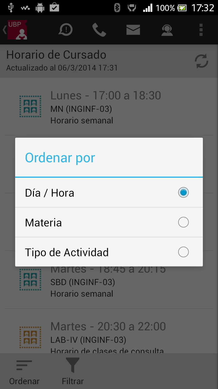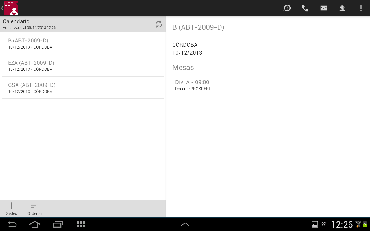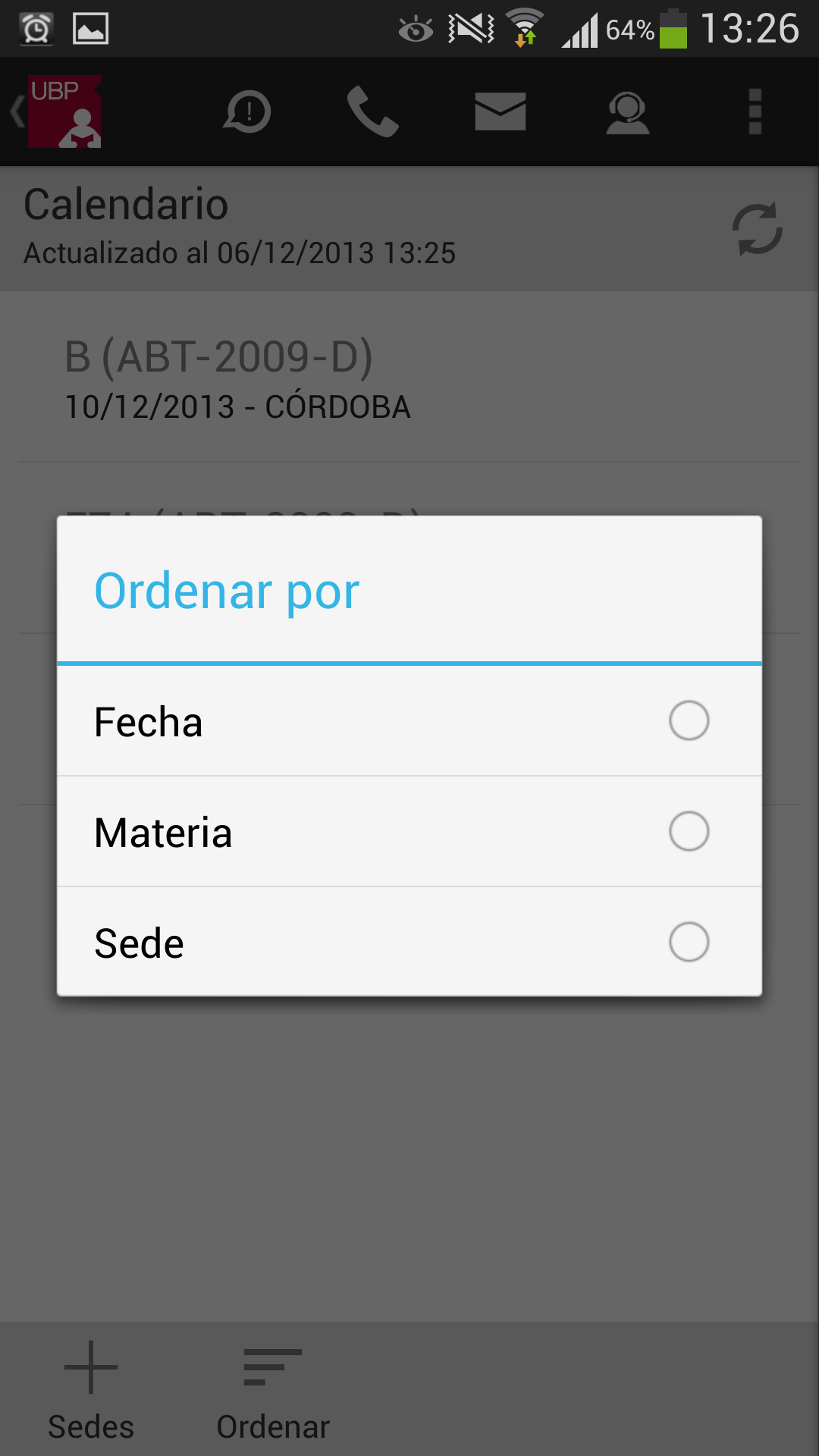 - Ordenar: Permite ordenar la lista por: fecha, materia o sede. Esta selección quedará registrada como su favorita.