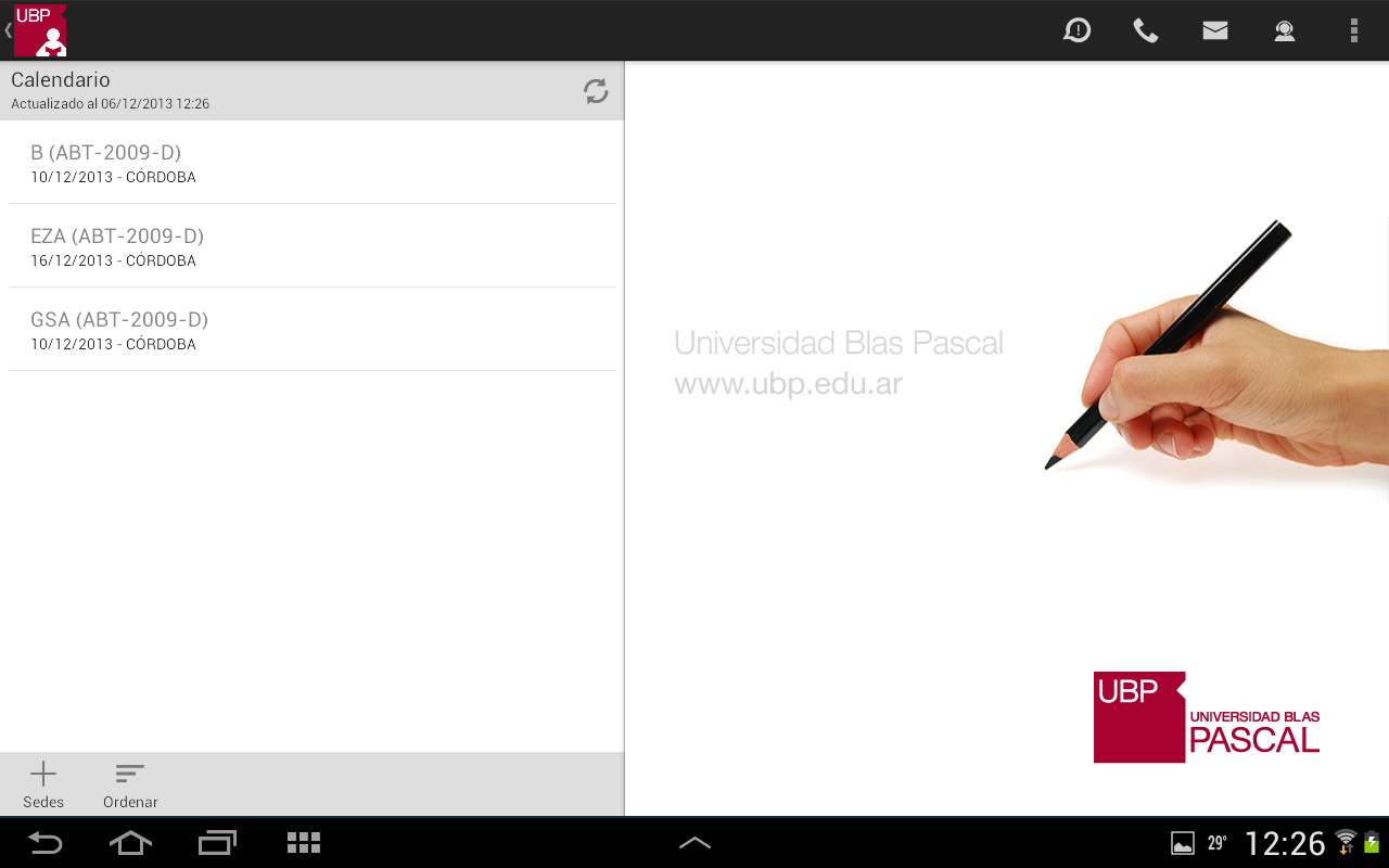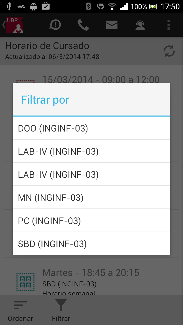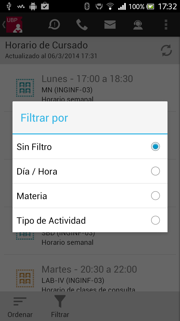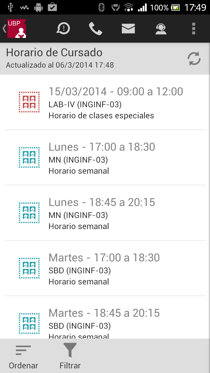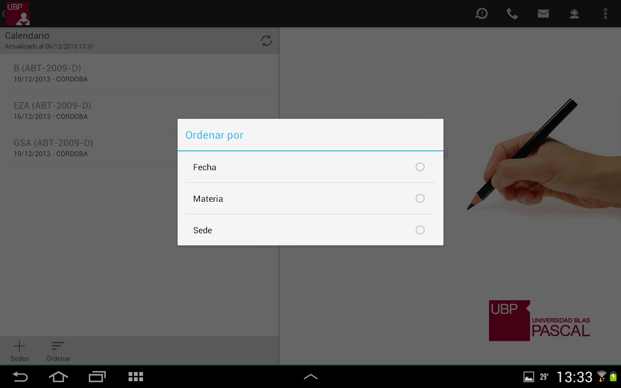 - Ordenar: Permite ordenar la lista por: fecha, materia o sede. Esta selección quedará registrada como su favorita.