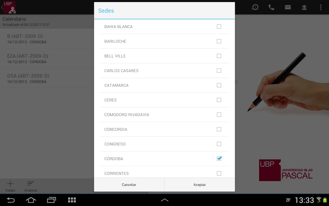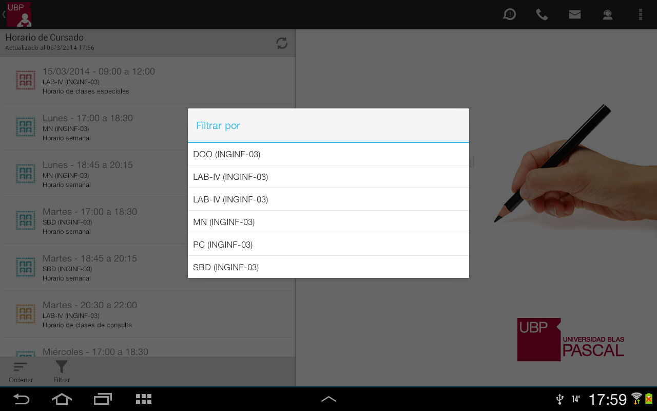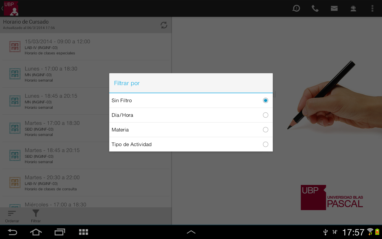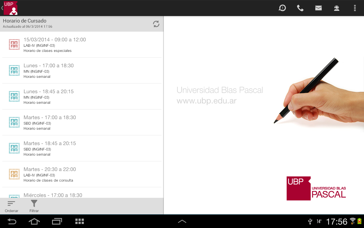 - Ordenar: Permite ordenar la lista por: fecha, materia o sede. Esta selección quedará registrada como su favorita.