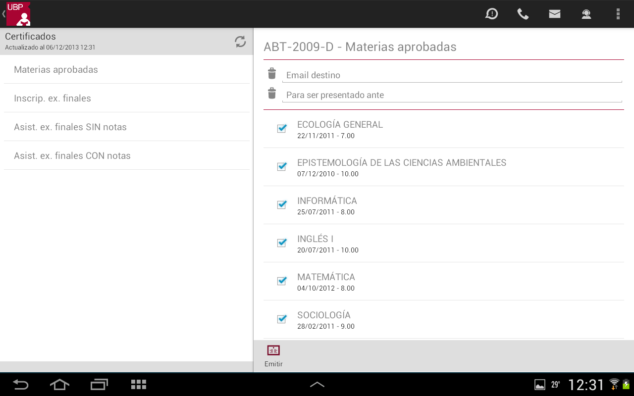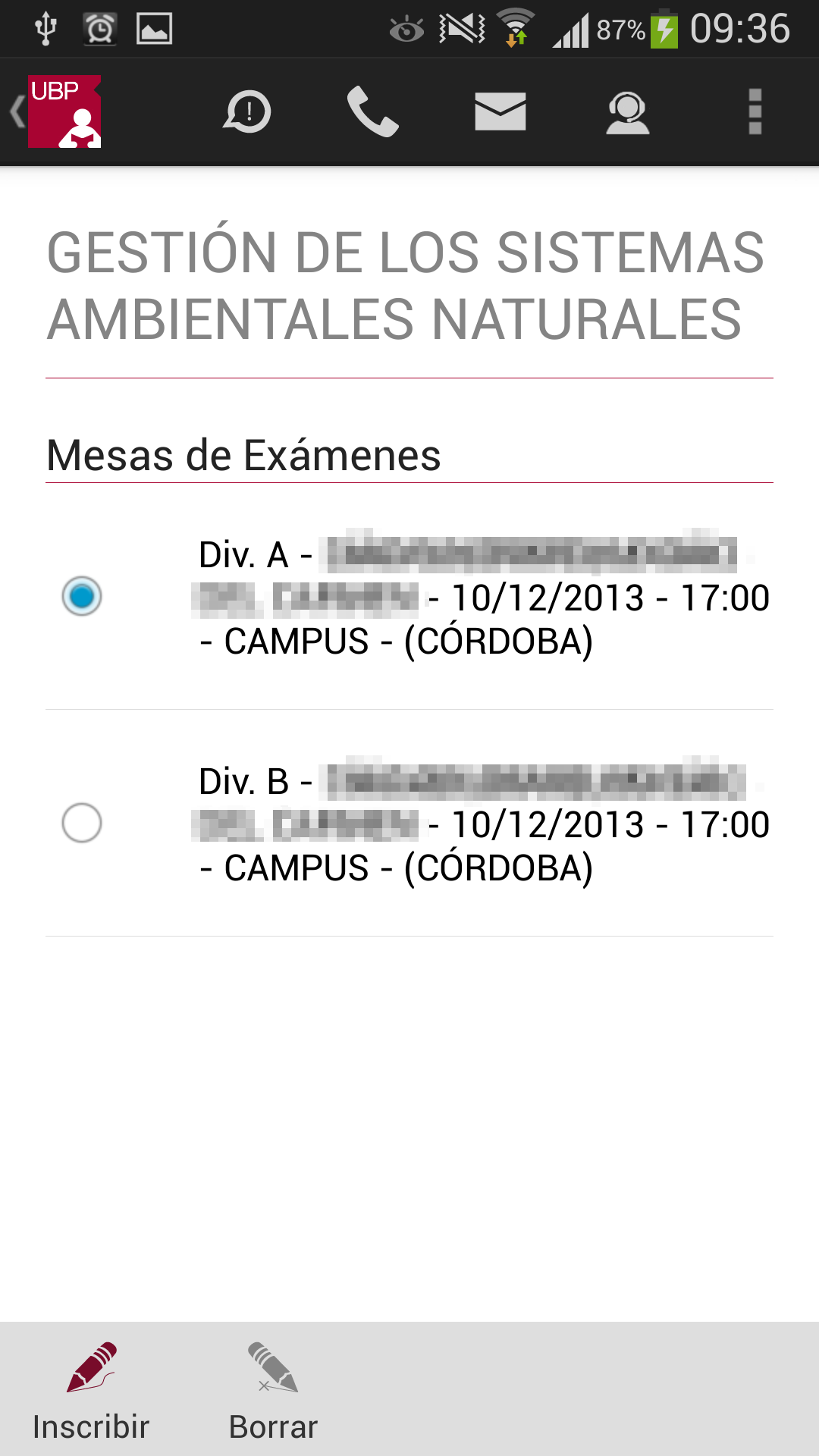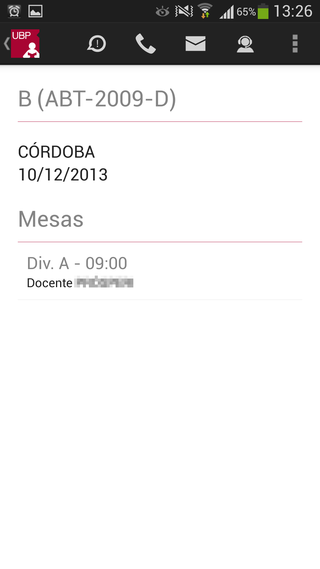 Al seleccionar una materia (tocando sobre la misma), se podrá acceder a más información acerca de la mesa de examen final: