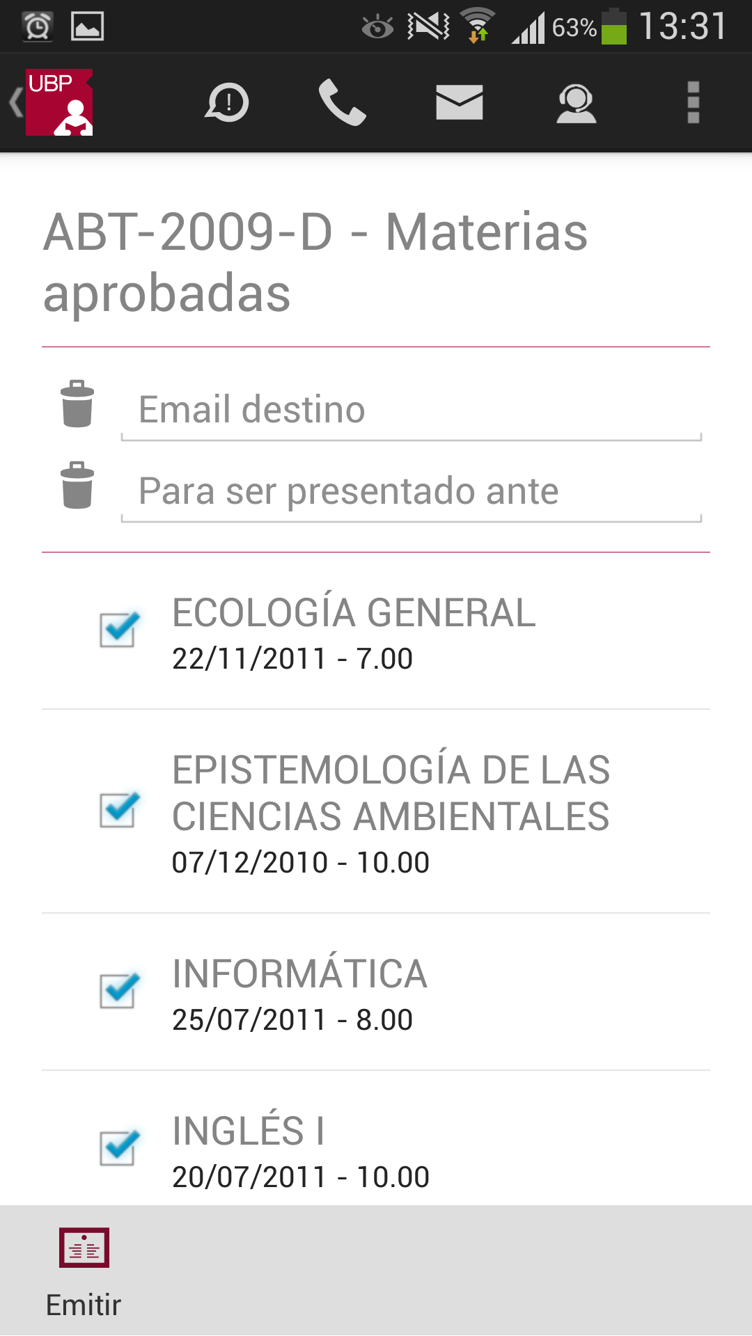 - E-mail de destino: Es la cuenta de email a la que se enviará el certificado emitido en formato pdf. Si informa una cuenta diferente de la que Ud. tiene registrada en sus datos personales (opción Mis Datos en la plataforma miUBP), el sistema enviará el certificado a la cuenta informada con copia a su cuenta.