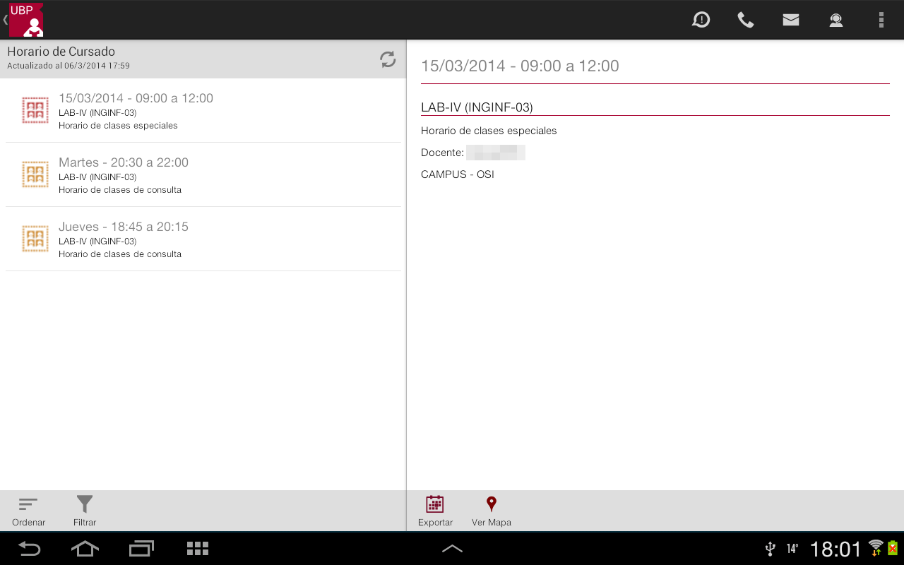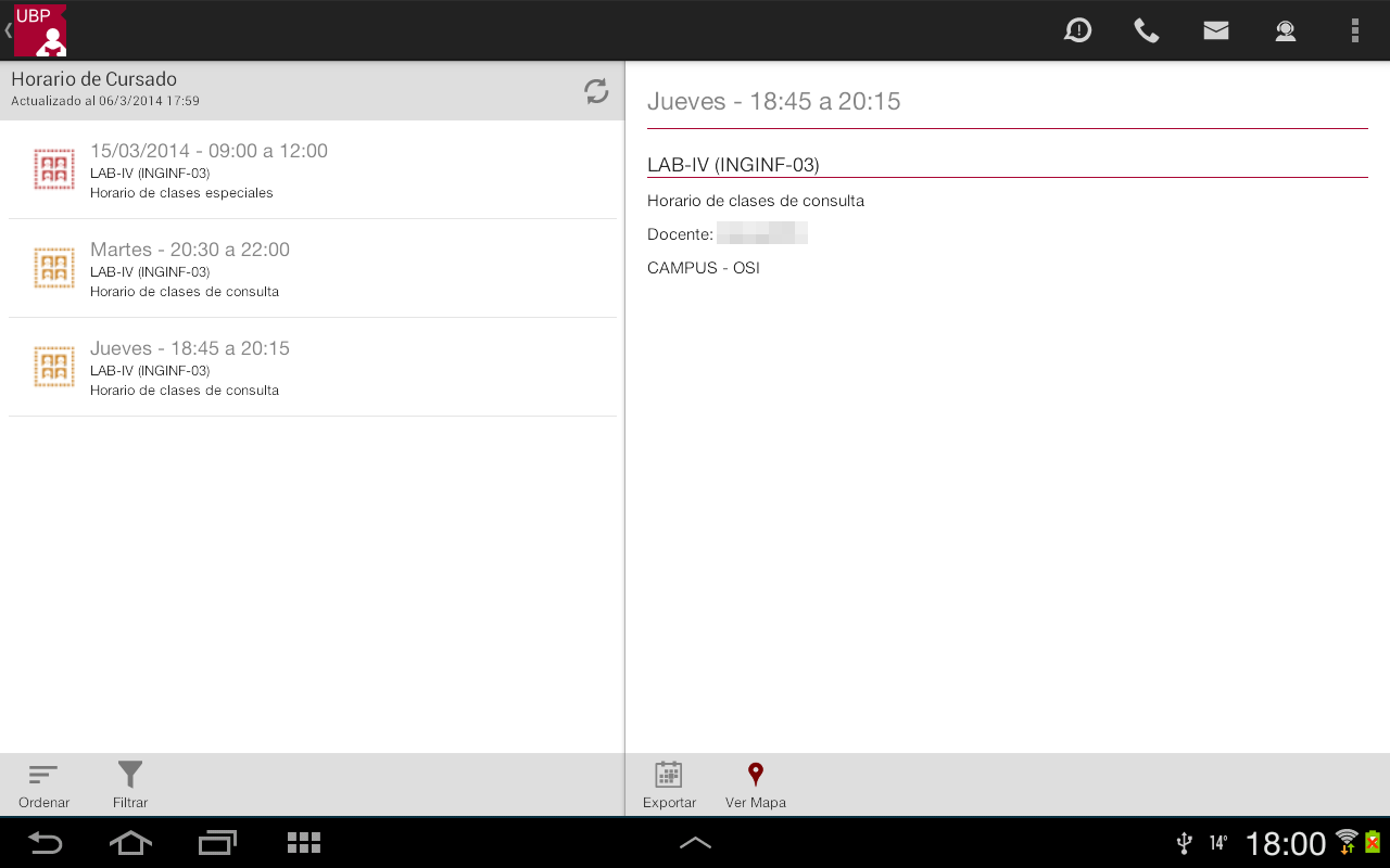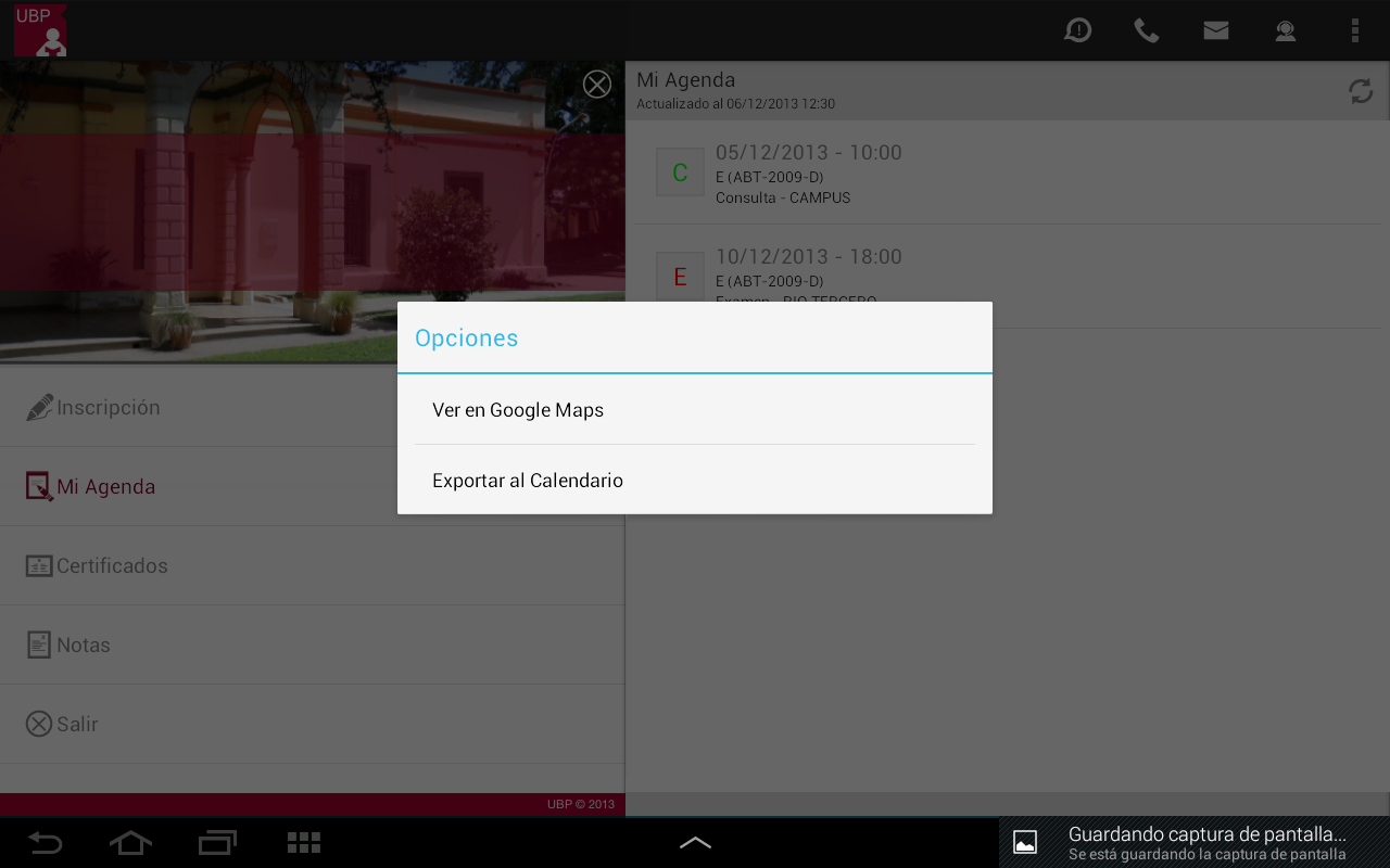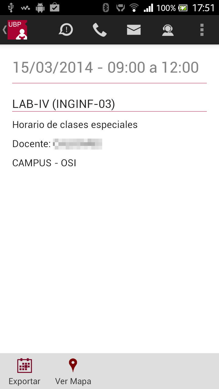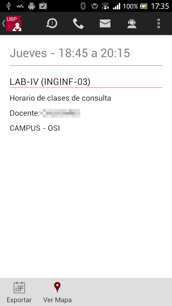 Exportar: Esta opción agendará el horario en Google Calendar. Si no tiene instalado Google Calendar o la versión de Android requerida, la aplicación le informará a través de un mensaje.