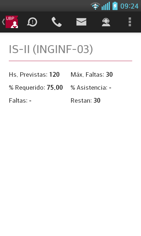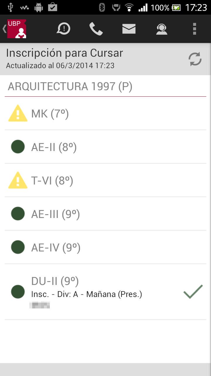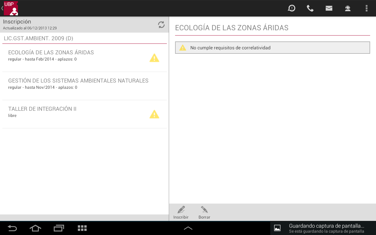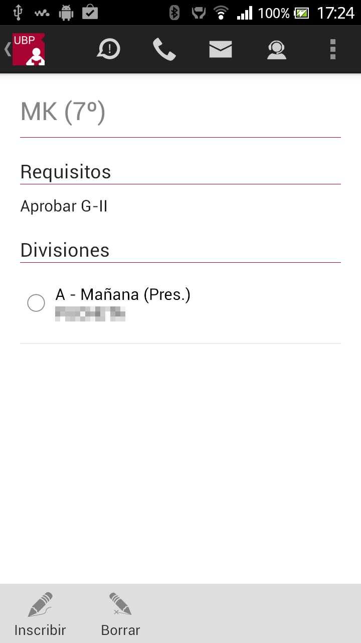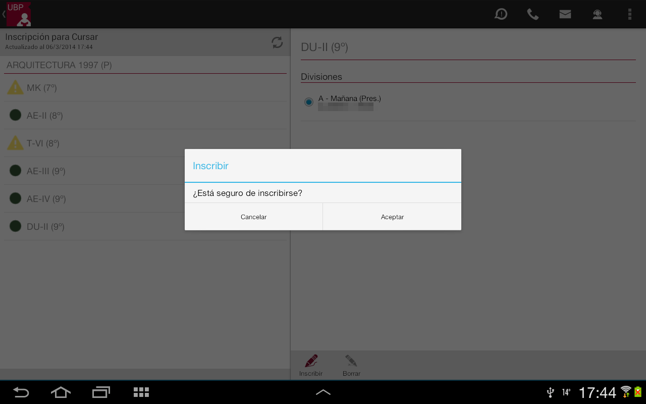 Para realizar la inscripción o visualizar más información deberá seleccionar la materia (tocando sobre la misma). La aplicación le mostrará la siguiente información: