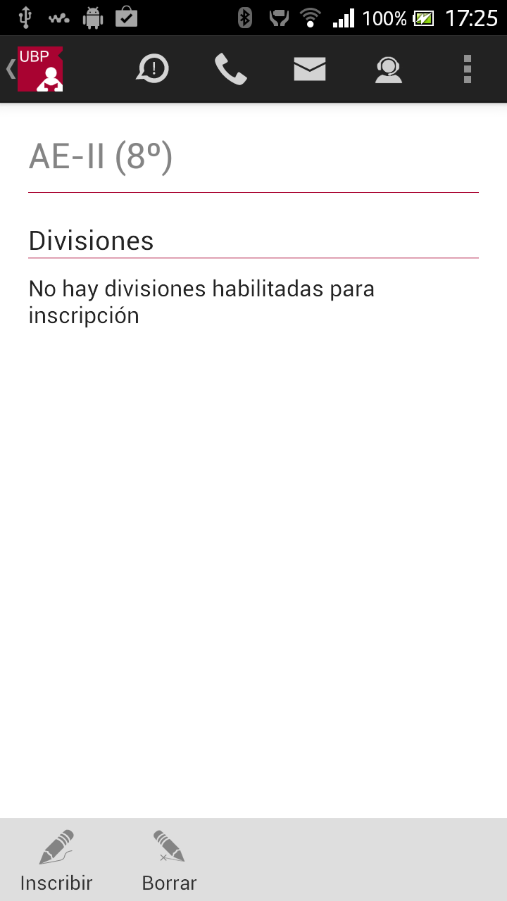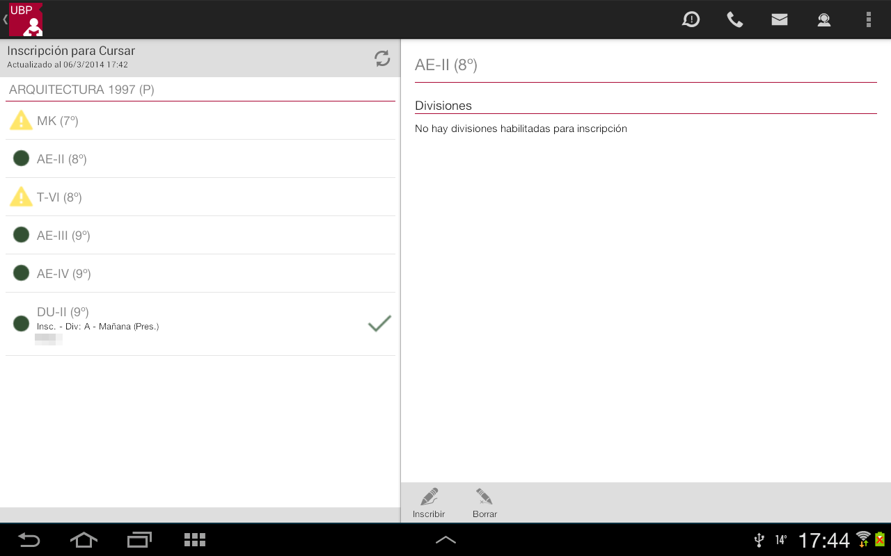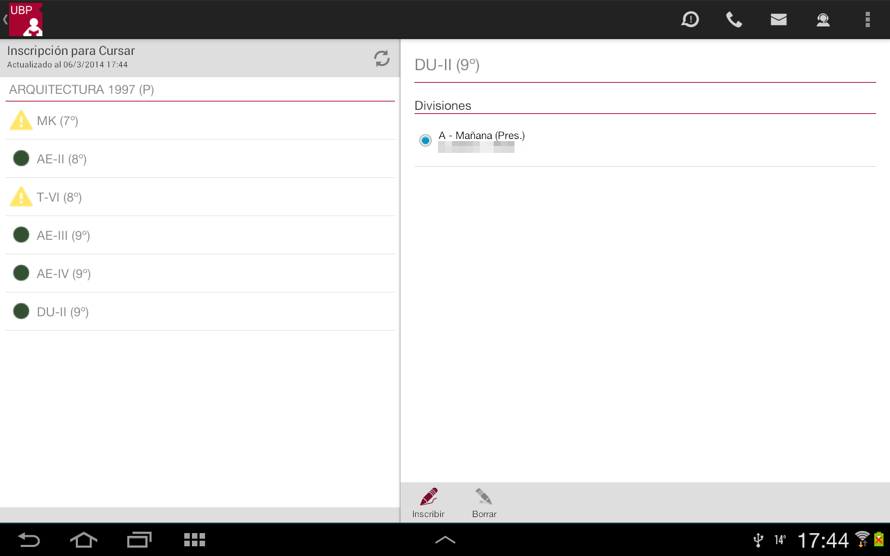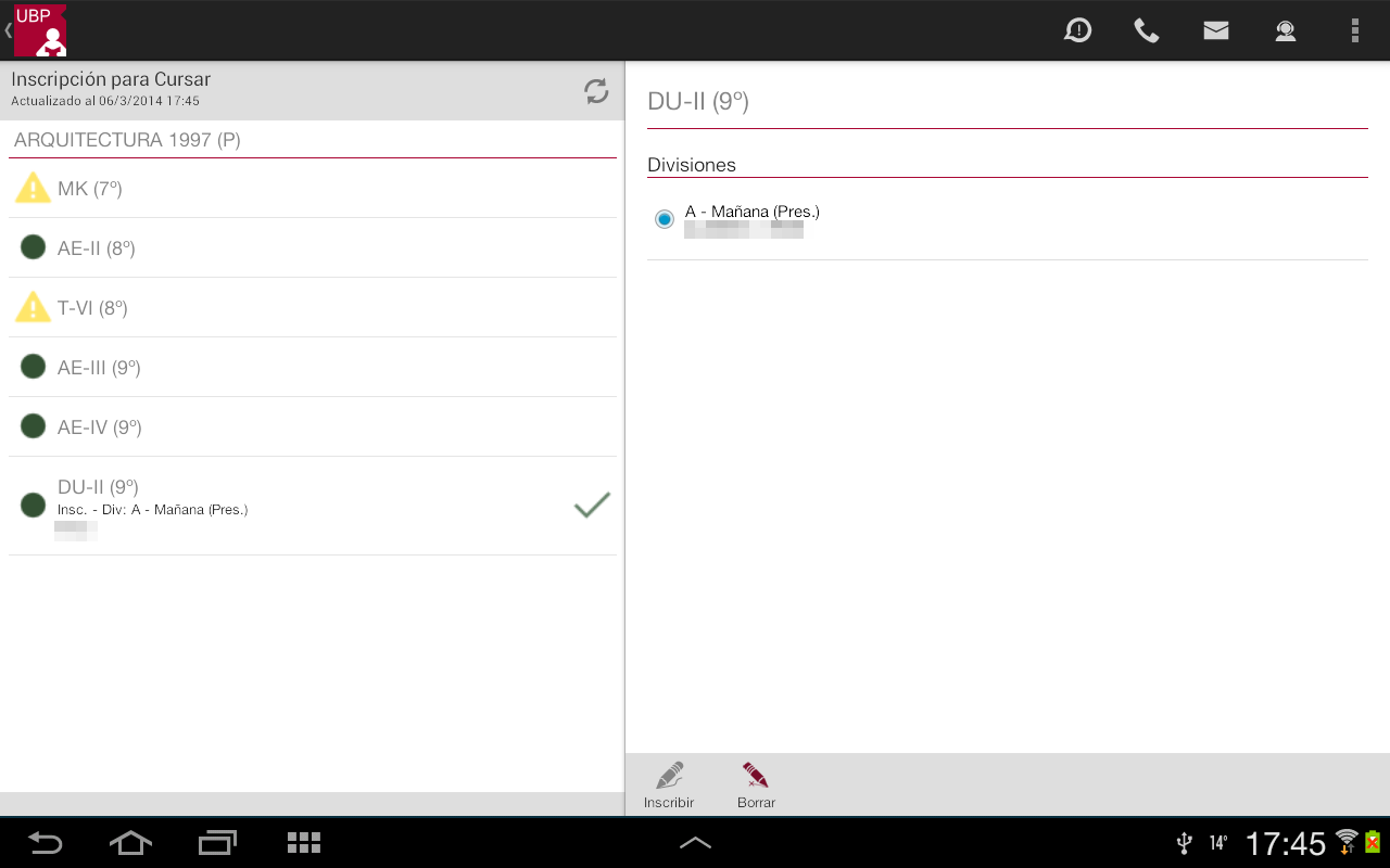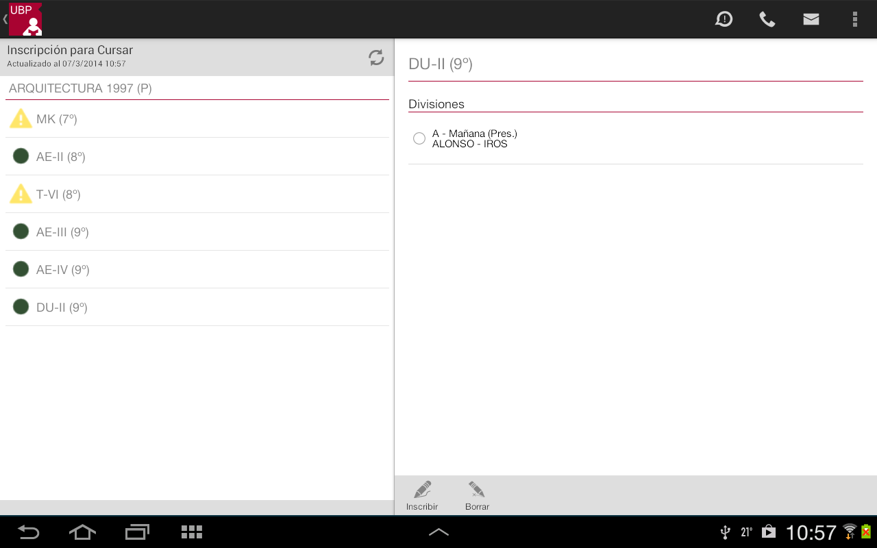 Borrar: Permite desinscribirse de la materia. Este botón se habilita siempre que Ud. esté inscripto en alguna división.
