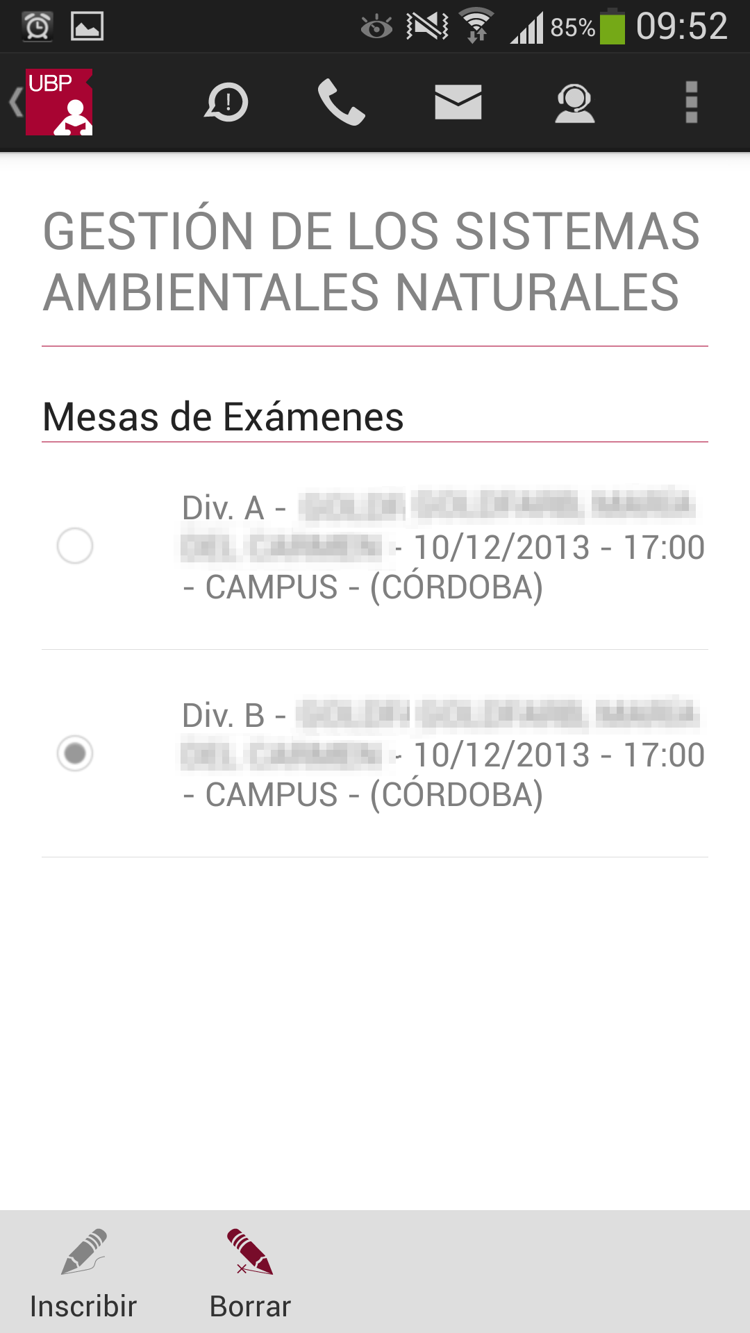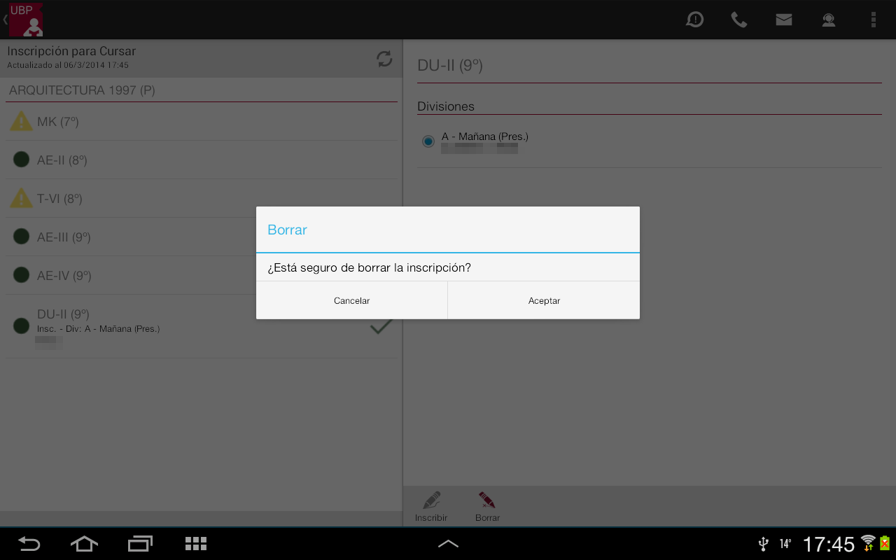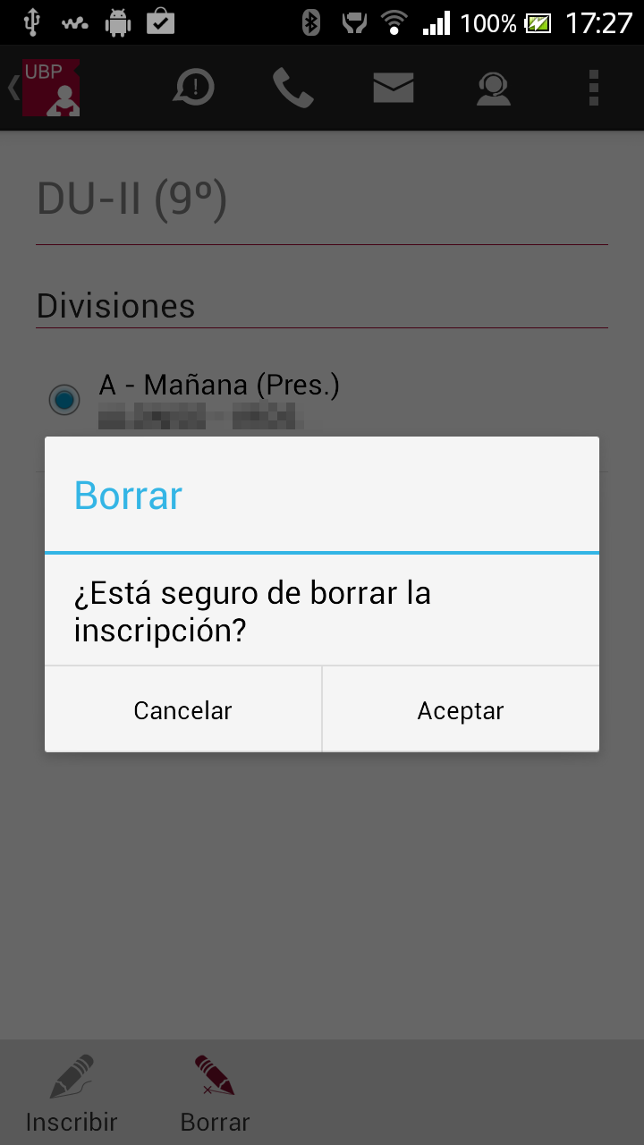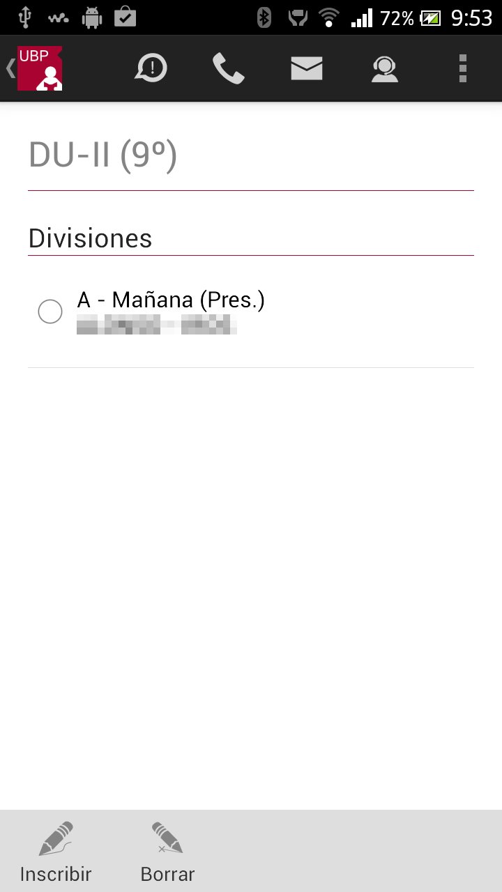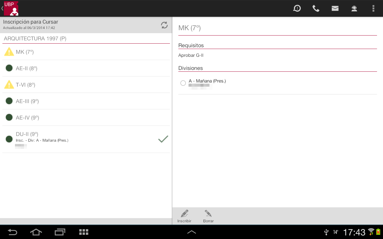 Borrar: Permite desinscribirse de la materia. Este botón se habilita siempre que Ud. esté inscripto en alguna división.