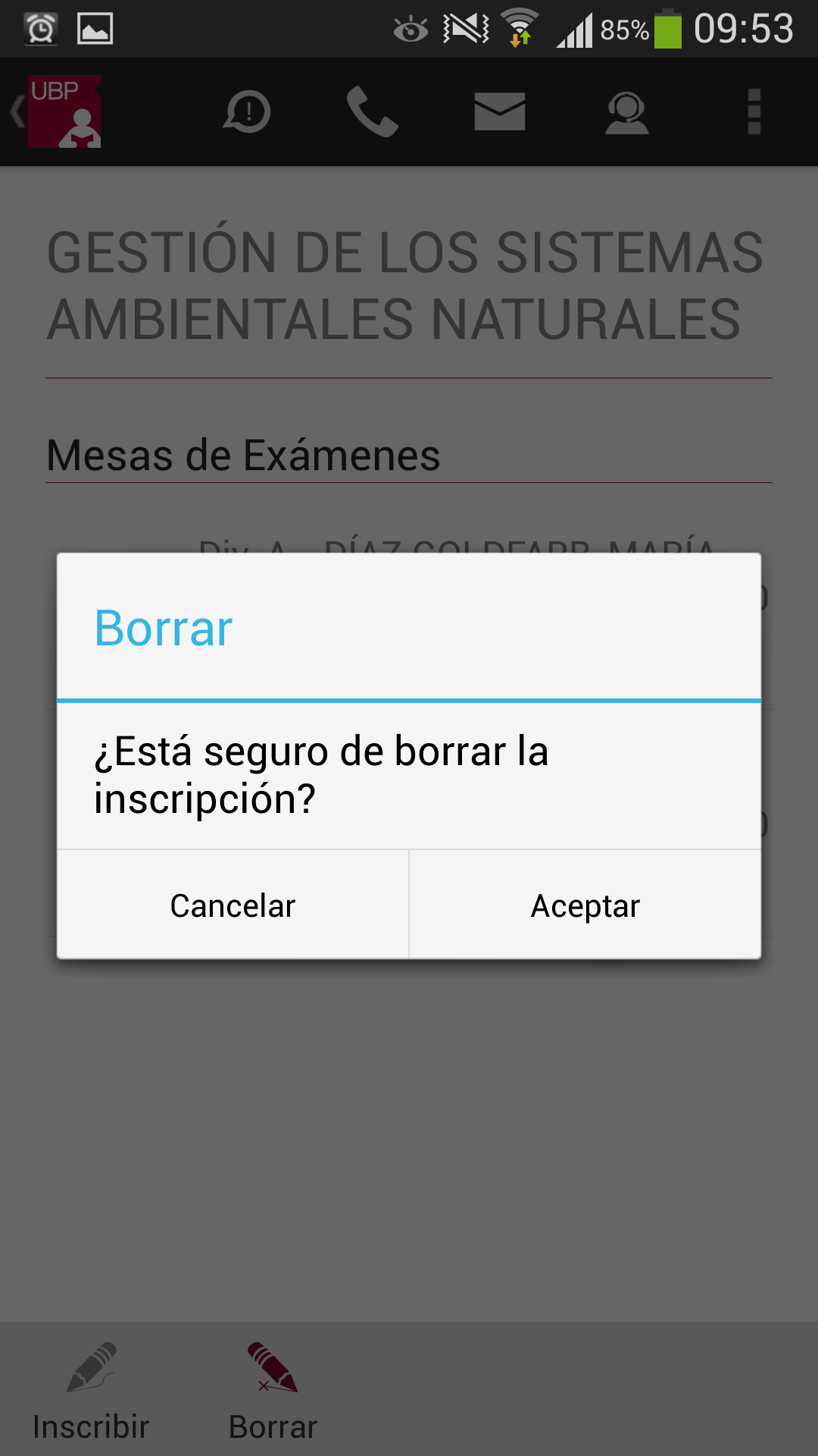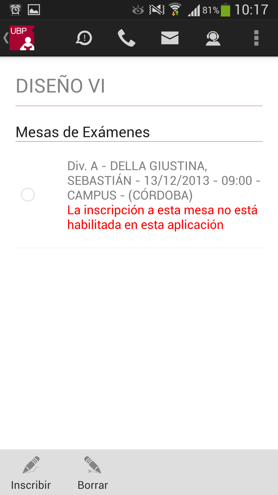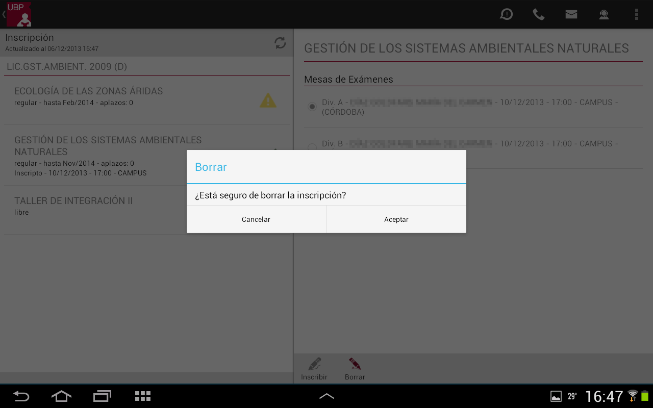 Borrar: Permite desinscribirse al examen. Este botón se habilita siempre que Ud. esté inscripto en alguna mesa y esta mesa esté habilitada (no tenga observación en rojo)