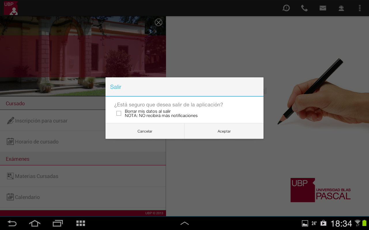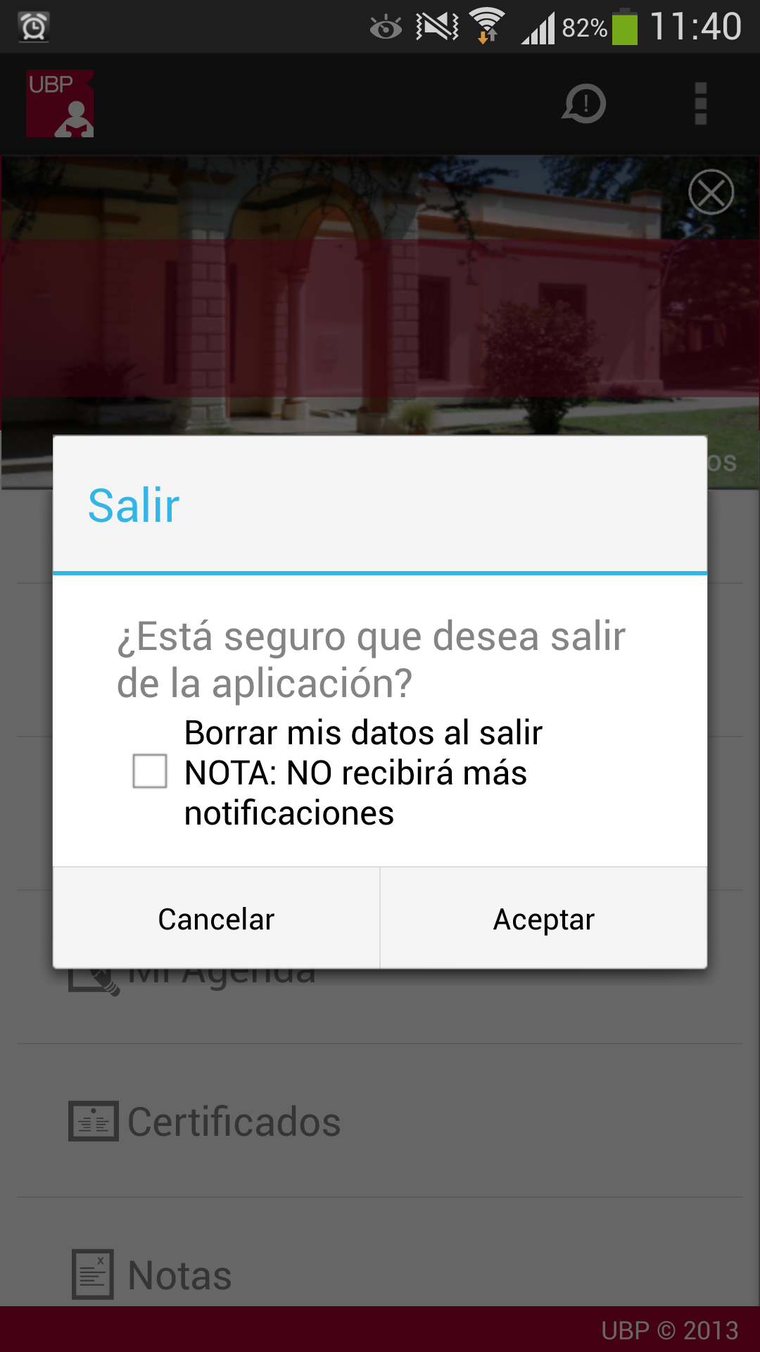 Esta opción le permite salir de la aplicación. Si marca el tilde "Borrar mis datos al salir" se borrará toda información asociada a su cuenta, por lo que cuando ingrese, se le solicitará que informe su usuario y contraseña nuevamente. Además, no recibirá notificaciones mientras no esté conectado.