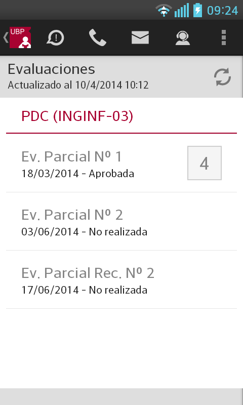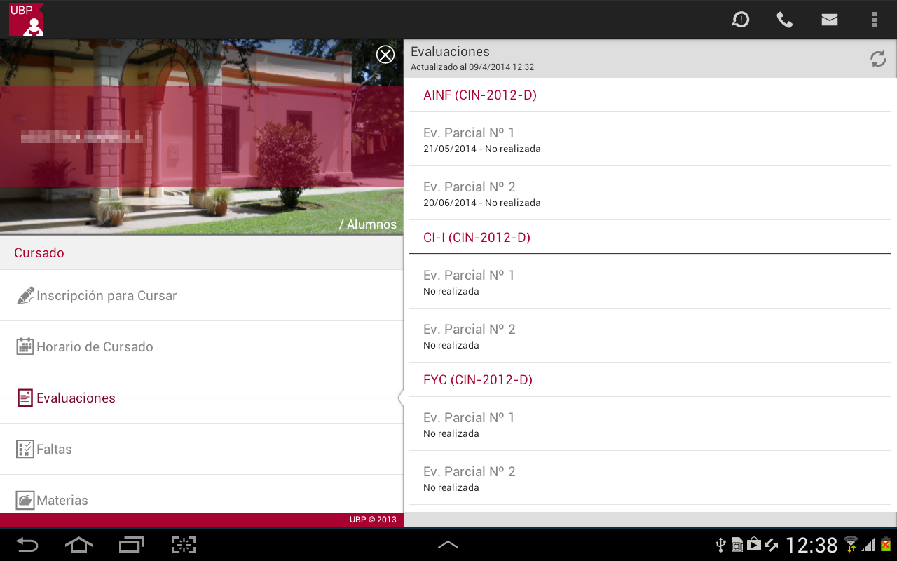 Evaluaciones: Permite consultar información acerca de las evaluaciones en las materias que está cursando.
