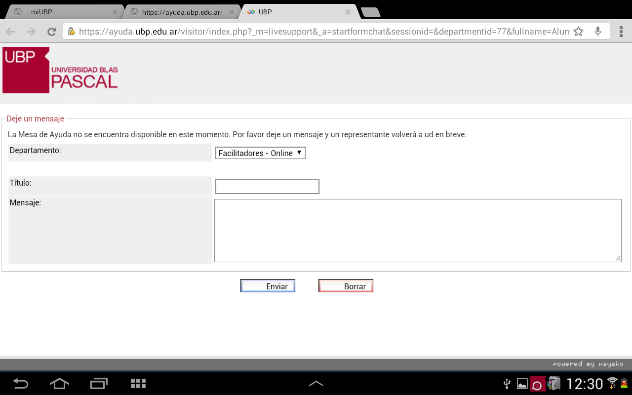 En el caso que no haya personal de la mesa de ayuda disponible en ese momento, le aparecerá un formulario de contacto. Podrá completarlo y enviarlo para ser contactado a la brevedad.