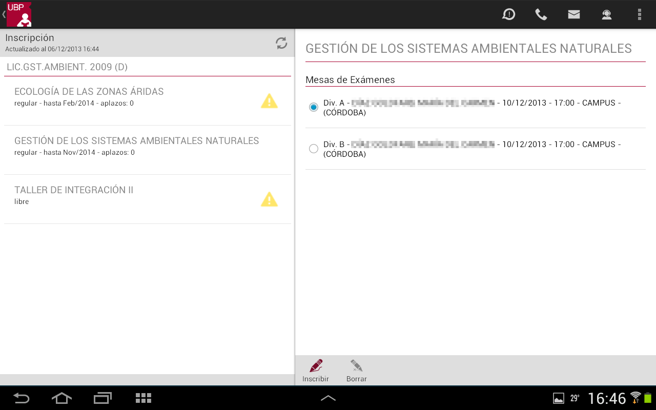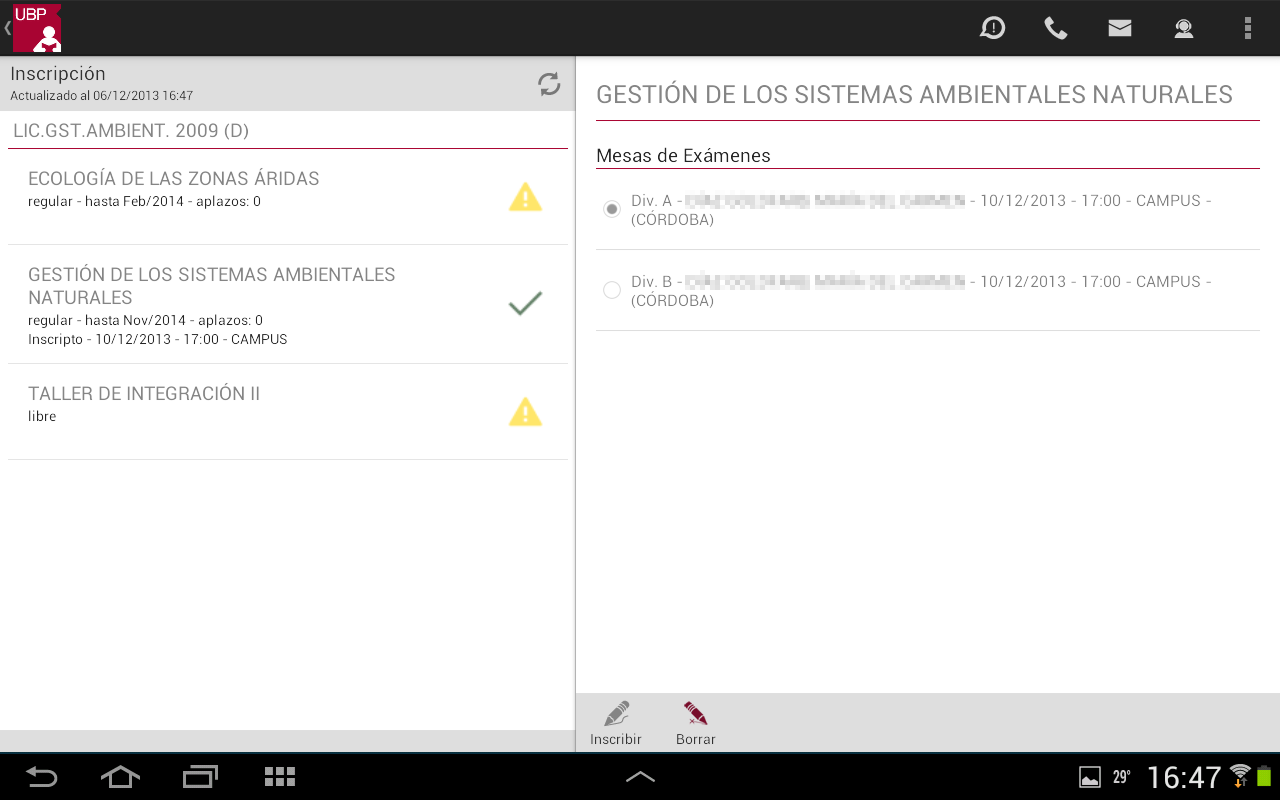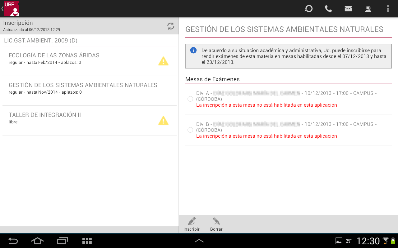 - Mesas de exámenes habilitadas: Se muestra la lista de mesas de exámenes habilitadas para la materia con los siguientes datos: División, Docente, Fecha, Hora y Sede. En determinadas situaciones la aplicación podrá mostrar en rojo una observación cuando la mesa no está habilitada para su inscripción.