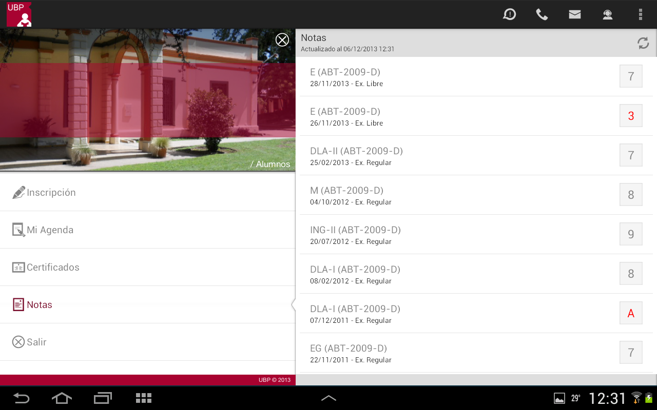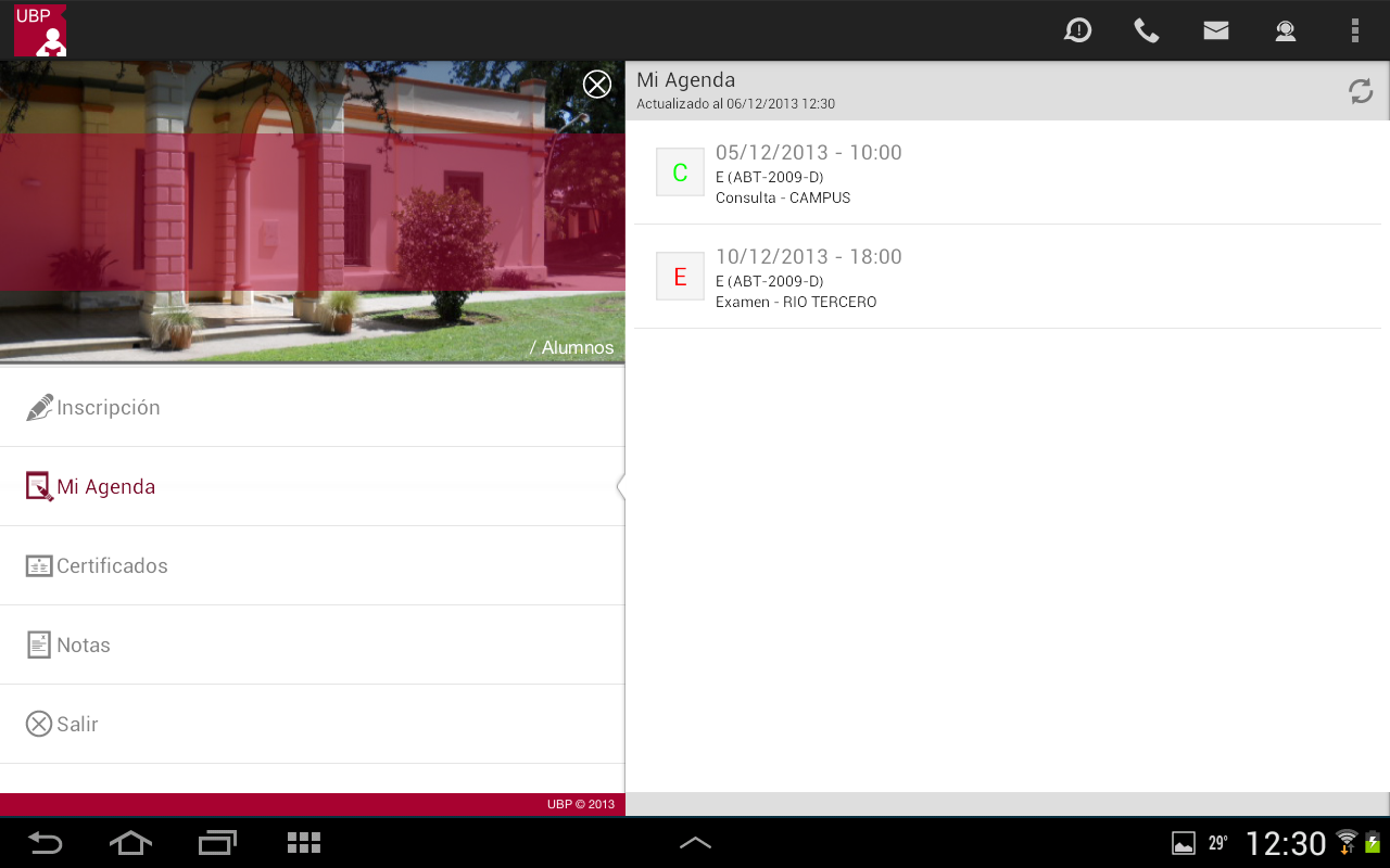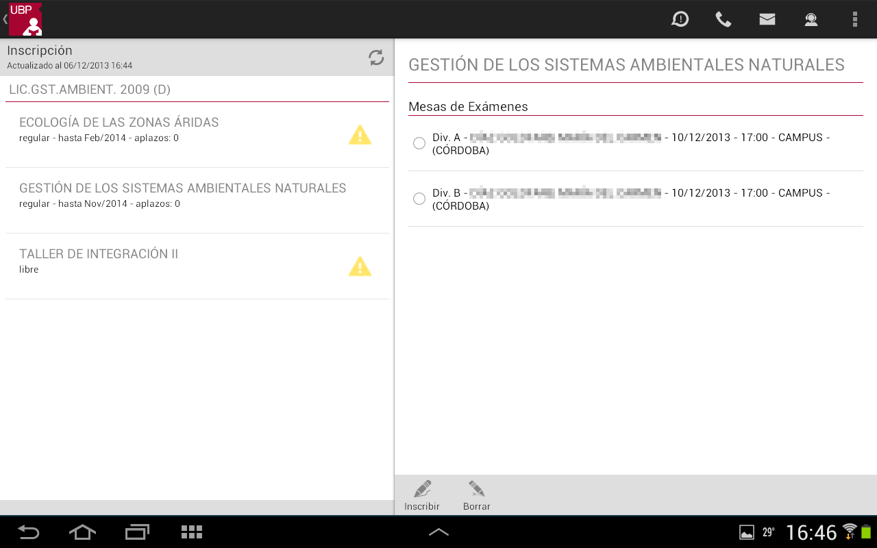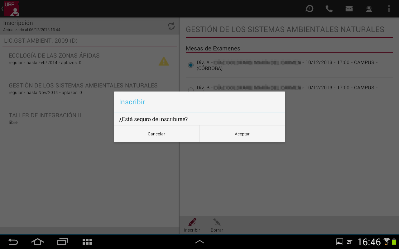 - Mesas de exámenes habilitadas: Se muestra la lista de mesas de exámenes habilitadas para la materia con los siguientes datos: División, Docente, Fecha, Hora y Sede. En determinadas situaciones la aplicación podrá mostrar en rojo una observación cuando la mesa no está habilitada para su inscripción.