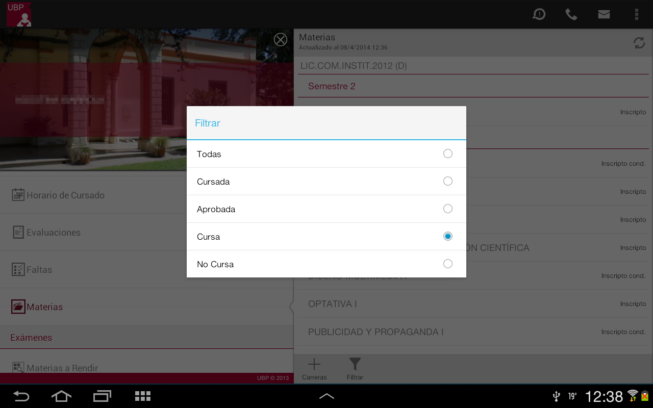 Materias: Permite consultar su situación en cada una de las materias de la carrera y acceder al material de estudio de cada una de ellas.