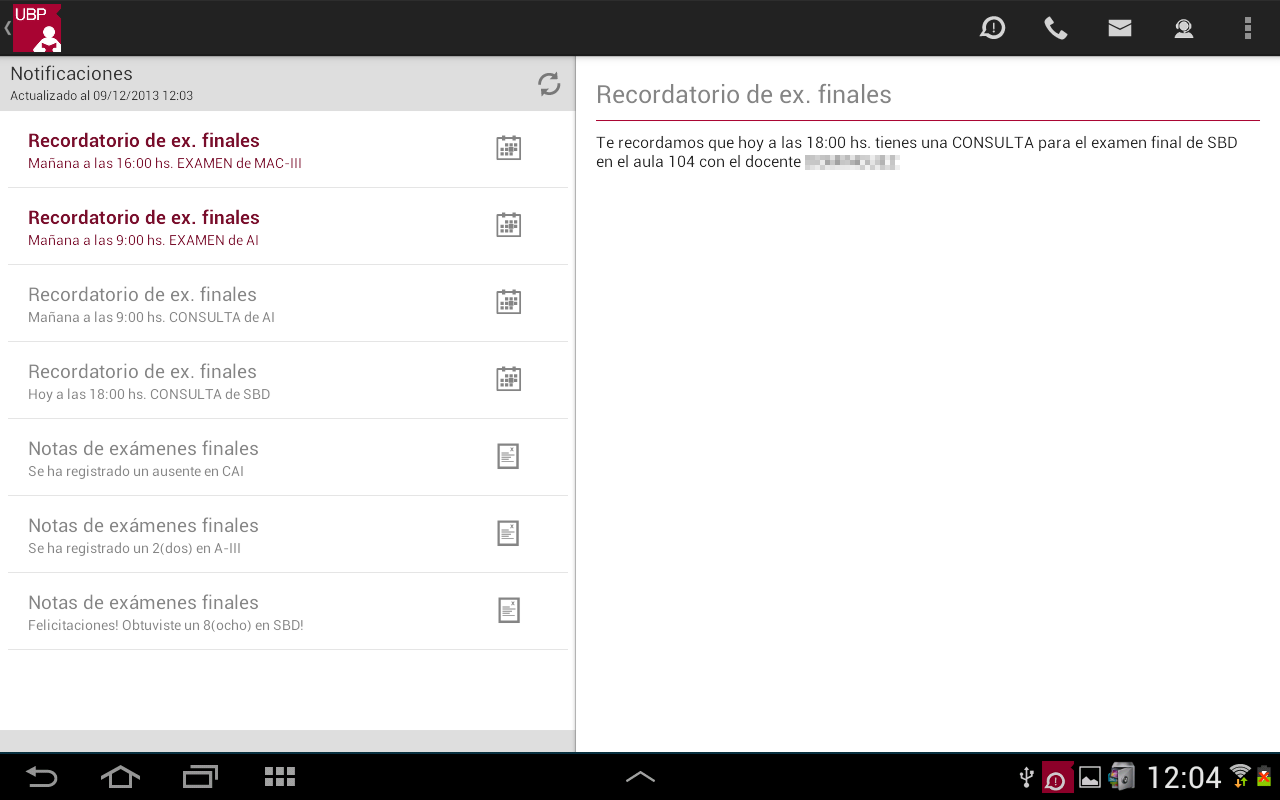 - En caso de estar inscripto para un examen final de la materia, se indicará fecha, hora y lugar del mismo.