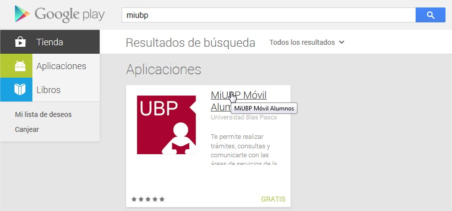 Luego buscar la aplicación. Para esto escribir "miubp" en la barra de búsqueda.
